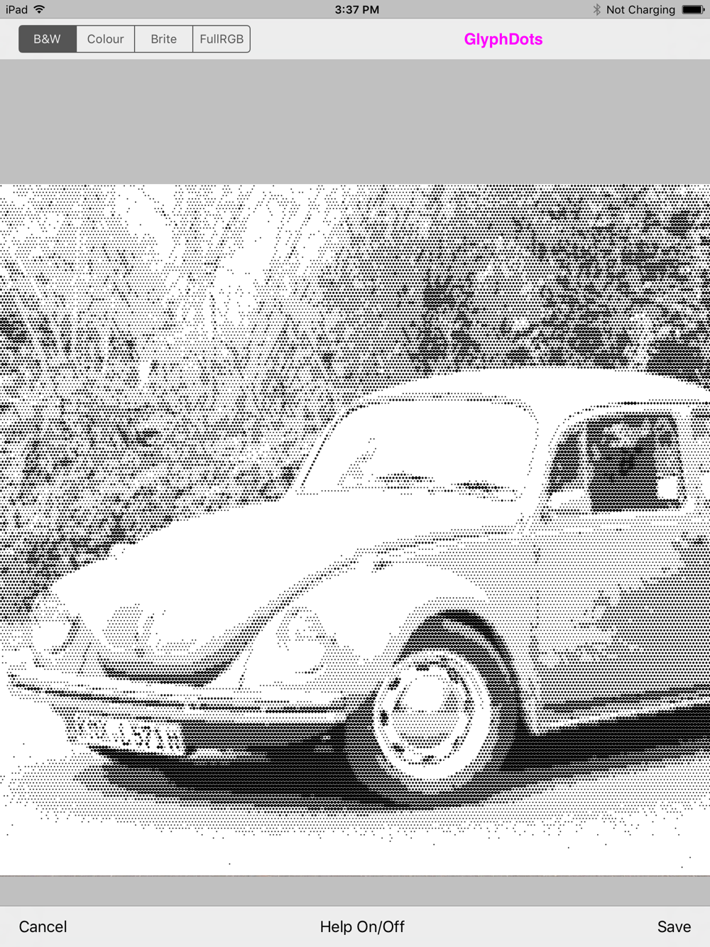 Make newsprint style or pop-art photos out of the pics in your Photo Roll. Photos are made of tiny graphics called glyphs. Choose from two dot sizes, lines, waves, dollar signs, circles and partial circles, or tiny shamrocks. Use One or Multi option to tell if you want one size glyphs thruout the photo, or to adjust the glyph size based upon the image brightness.