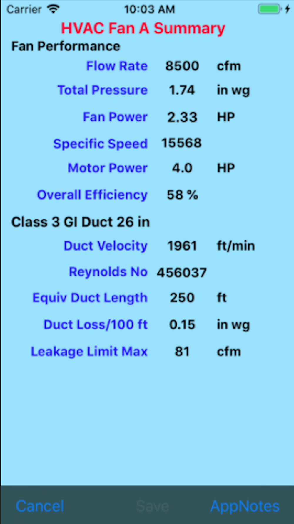A comprehensive summary is provided as shown in the screen shot that includes different performance characteristics of a fan-duct system. This would help in evaluation of different fans for a given application. App notes is provided for a quick reference that has brief descriptions of different fan performance characteristics. In addition link is provided to a complete documentation on implementation and validation of different math-models used in all apps.
