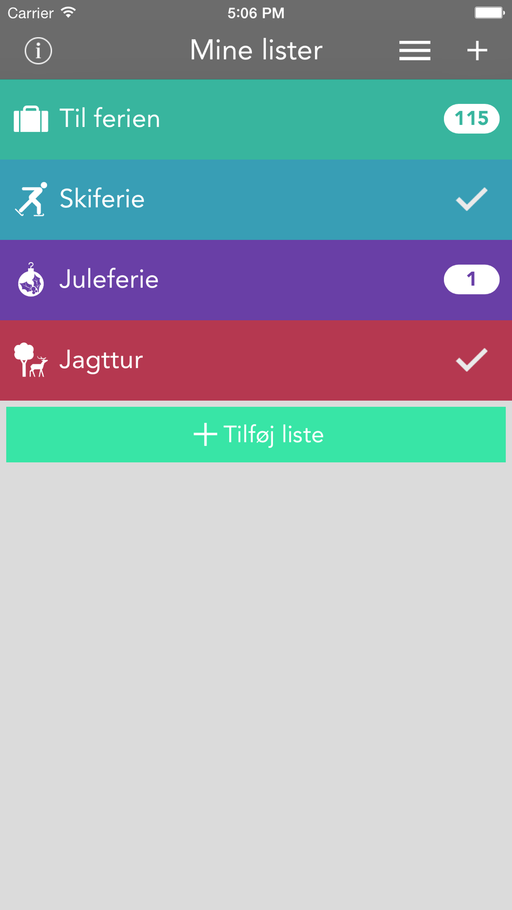 Listen indeholder mere end 100 ting, som du skal overveje, når du pakker kufferten til din rejse. Du kan markere de ting, som du allerede har pakket og nemt bevare overblikket over, hvad du mangler.