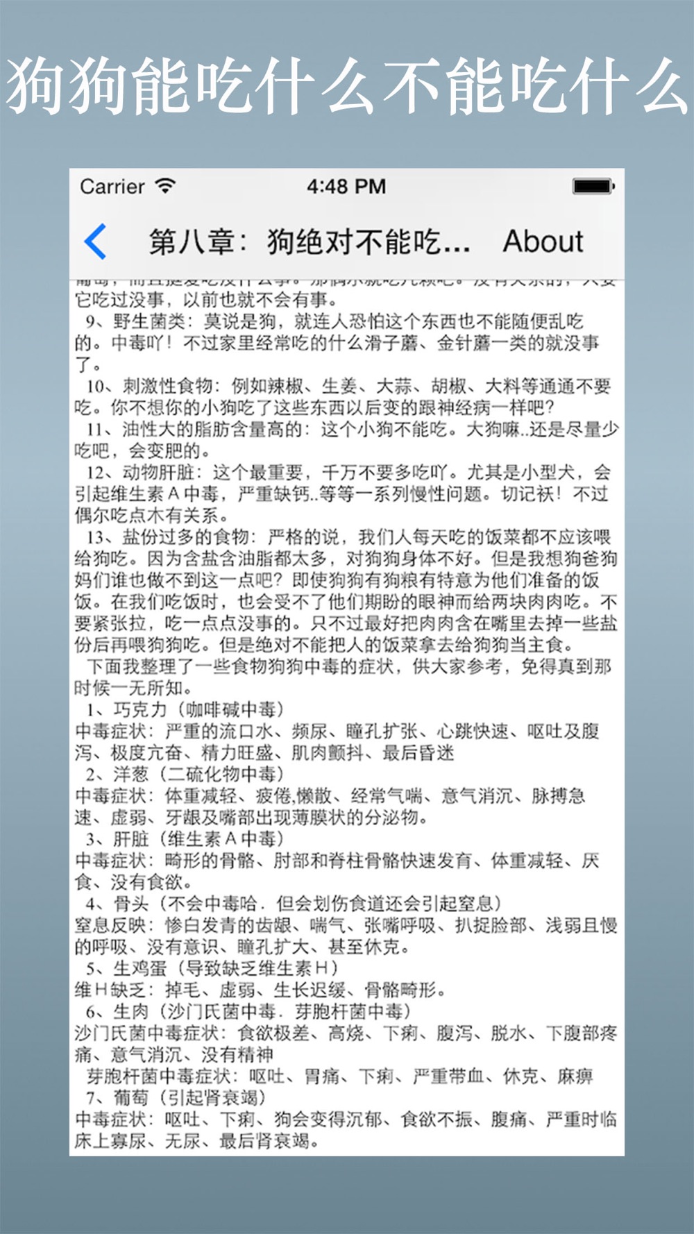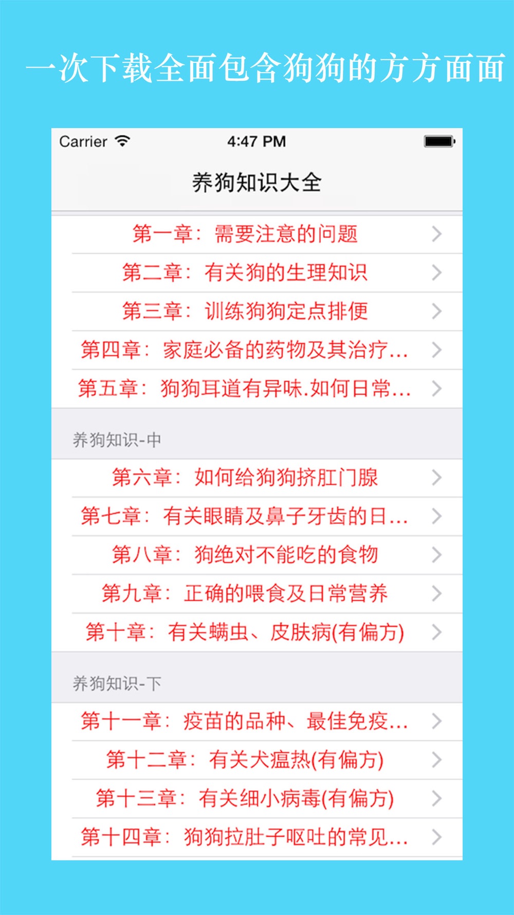 -----本应用全面介绍了养狗知识,内容包括: