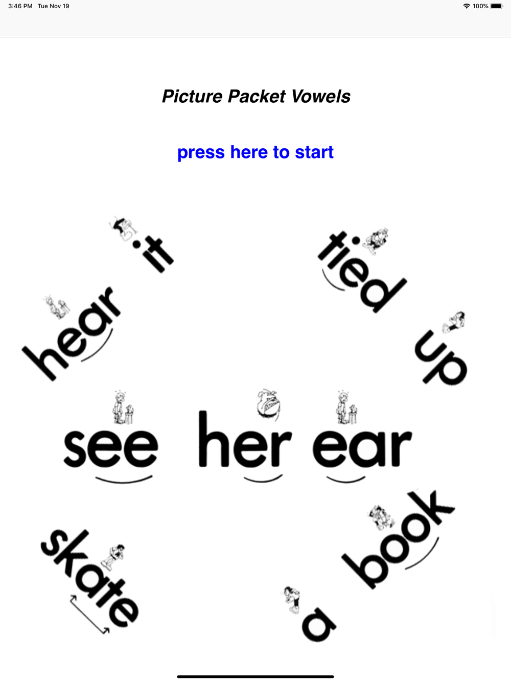 The Picture Packets-Vowels are the next to last step in transitioning the child from reading with sounds to reading with letters. At the Picture Packets-Transition level, all the sounds that make up a word are shown above the word they represent. At the Vowels level, only the vowel sounds are included as hints for the letters.