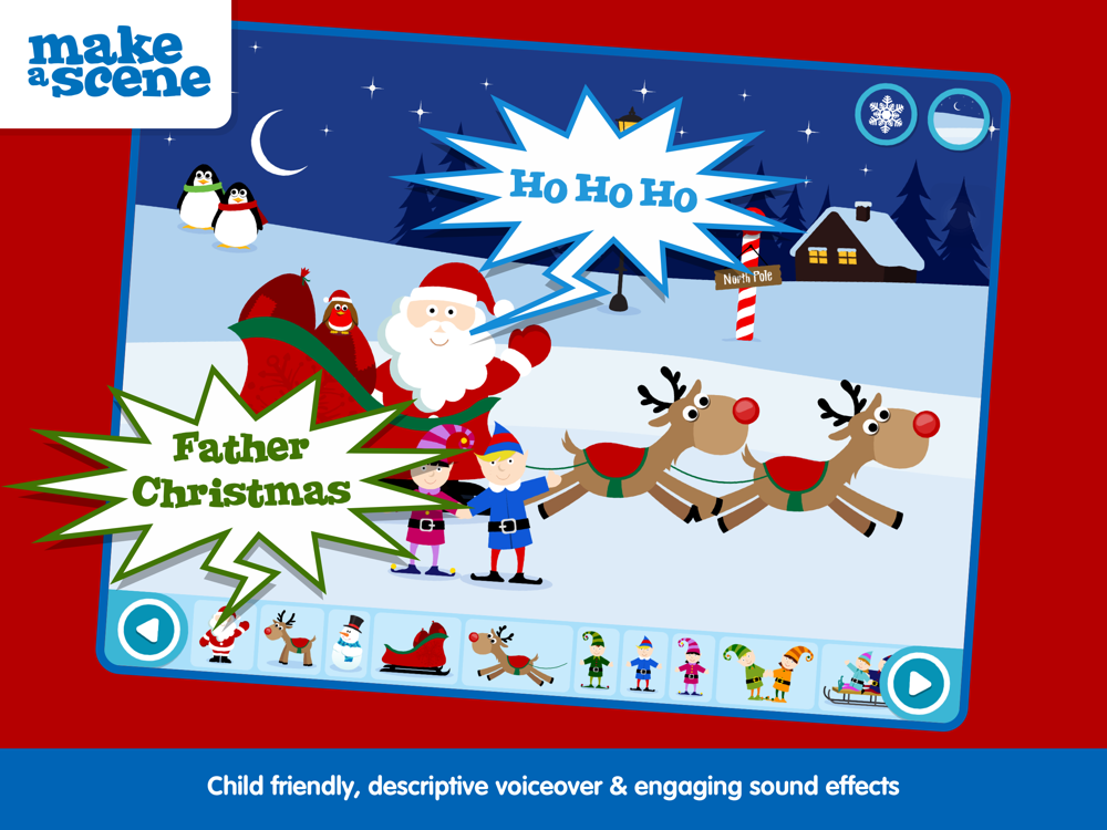Make a Scene Christmas uses drag and drop interactions, descriptive audio, fun sound effects and engaging animations to create an entertaining, educational platform. Children will have endless fun using their imagination to create their very own festive scenes.