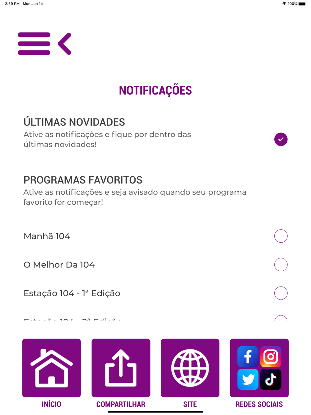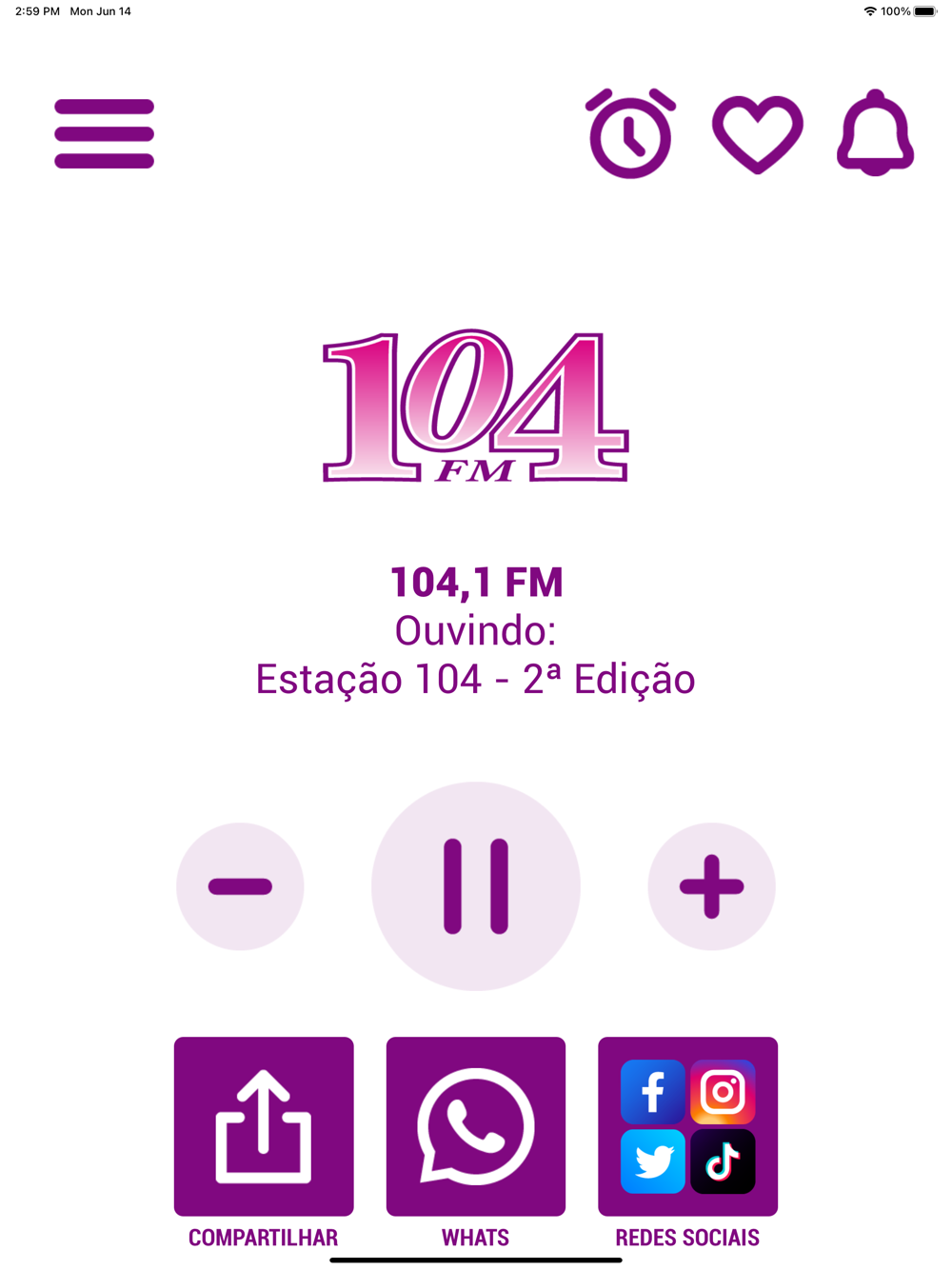 Aplicativo da Rádio 104 FM, uma emissora da Rede Pampa de Comunicação.