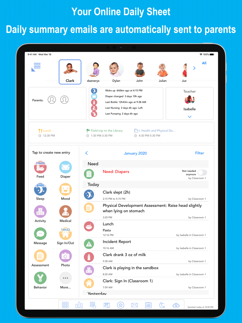 Record more than 30 different types of activities, automatically send daily update emails to parents, and ensure your childcare center remains compliant with local regulations.