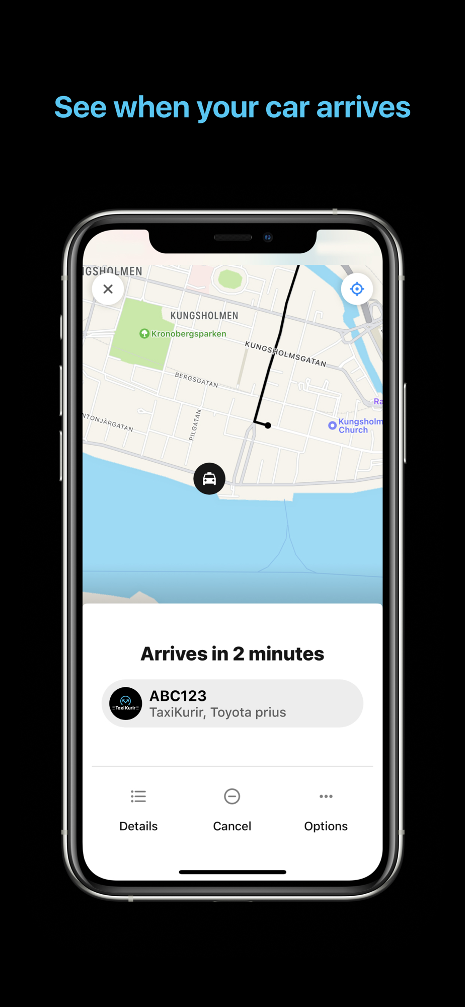 We notify you both when the taxi is on its way and when it has arrived. You can also follow your car directly on the map. The app provides you with the taxi's car number so you can smoothly and easily find your car! You find the taxi's car number on the back of the taxi sign.