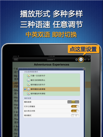 《英语口语系列》全文定位点读, 同步高亮显示. 长按任意单词即弹出词典, 同时可将单词加入生词列表. 不需要进度条式的拖拽, 没有查字典的繁琐. 最新支持耳机线控操作, 使用更加轻松便捷.