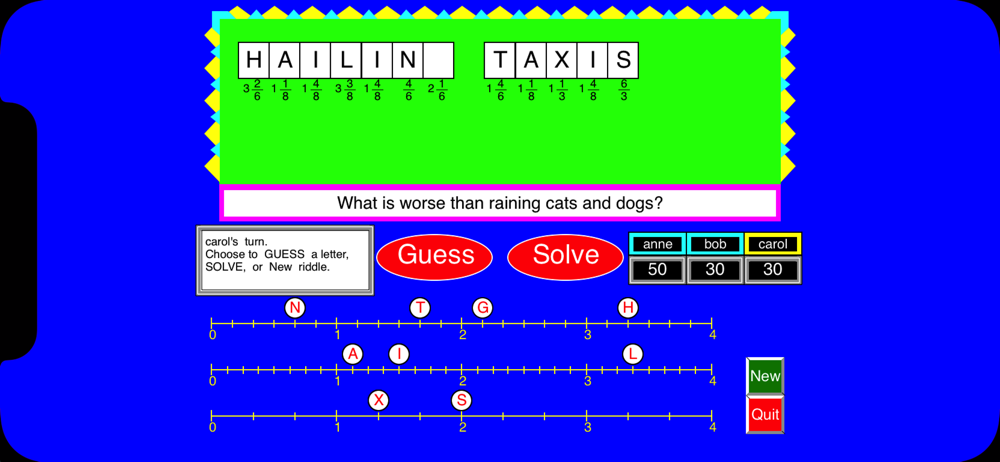 Math Galaxy Fraction and Decimal Riddles is a game like Wheel-of-Fortune, with the answers to math problems as clues to riddles and word jumbles. There are 500 riddles and 600 word jumbles with definitions. Riddles and jumbles are chosen randomly. Numbers for math problems are created randomly and cover fraction operations (fraction pies, fractions on a line, add, subtract, multiply, divide), decimal operations, and measurement (which includes adding, subtracting, multiplying and dividing length, volume/capacity, weight and time), and angles.