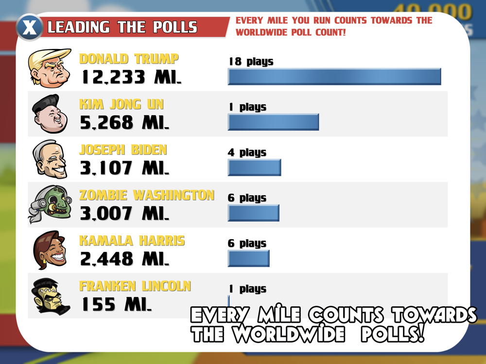 Every mile counts and included in the POLLS, so play often to keep your favorite candidate ahead of the race and collect boosts to help you run farther.