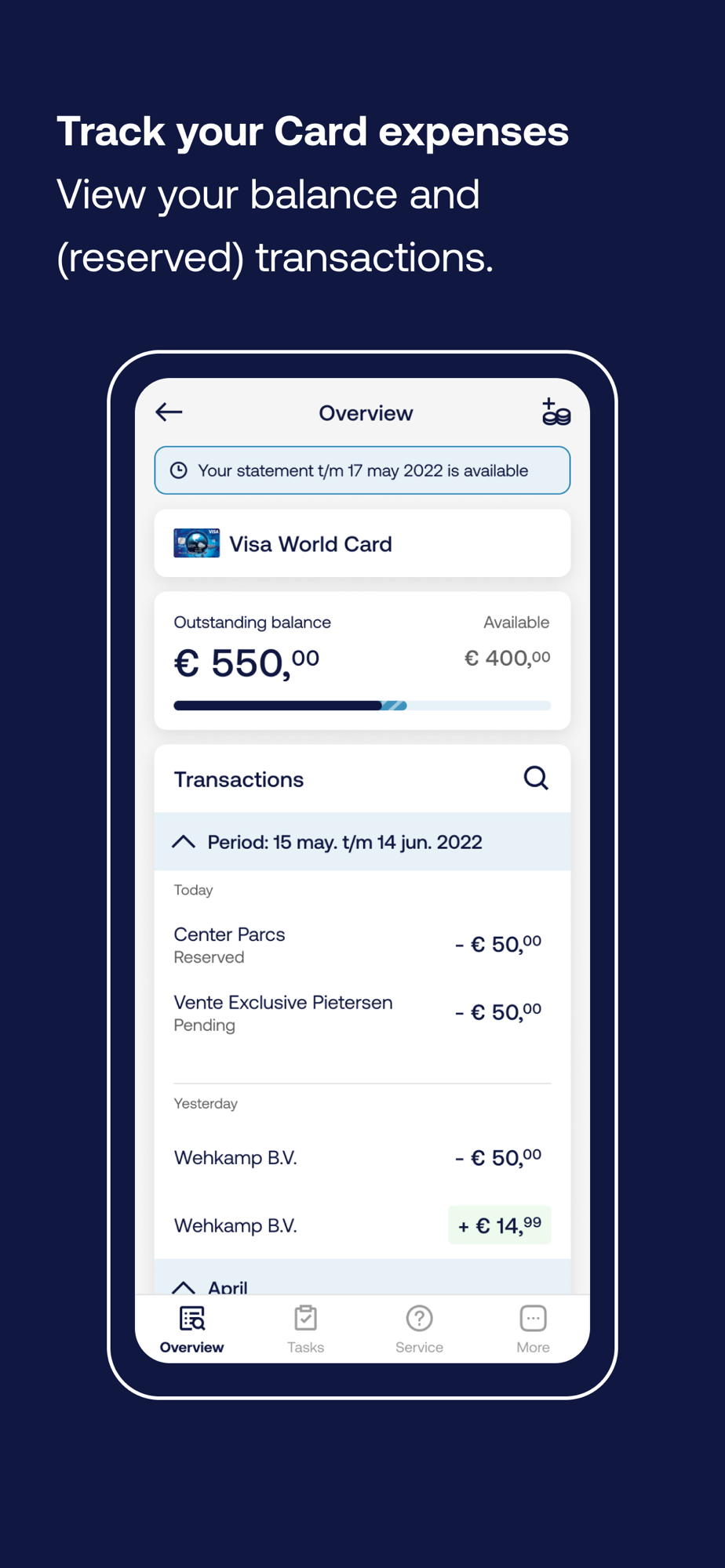 Keep track of your expenses wherever you are with the ICS Creditcard app. You’ll know what you have left to spend in an instant. Online payments become a breeze with facial recognition or fingerprint. Are you a few euros short on your next online order? No problem! Top up your Card quickly and easily via the app.