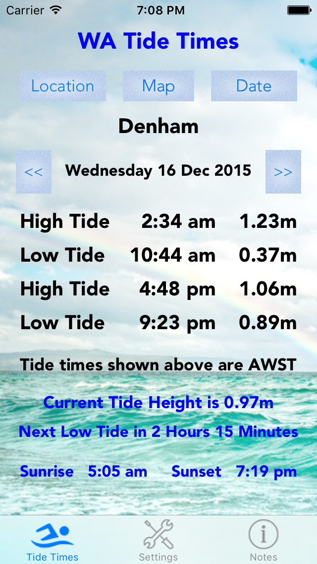 With this application you can track the tidal information all ports in Western Australia through to the end of December 2020. It shows the high and low tide times and tide heights for the day, or a future day that you select. Now included are the Sunrise and Sunset times, along with the current tide height and the time to the next high or low tide. Making it easier to plan that successful beach or fishing trip. A GPS Link and Maps are now included, although this will require a data connection, however no Internet access is required for selected lookups, so even if you are sitting in an area with no coverage you can still check the tides. All of the main ports and surrounding locations are covered, including, Fremantle, Albany, Broome, Bunbury, Esperance, Geraldton, Denham, Carnarvon, Exmouth, Onslow, Port Hedland, Cape Voltaire, Wyndham, Derby, Cape Domett, Thevenard Island and Port Walcott.
