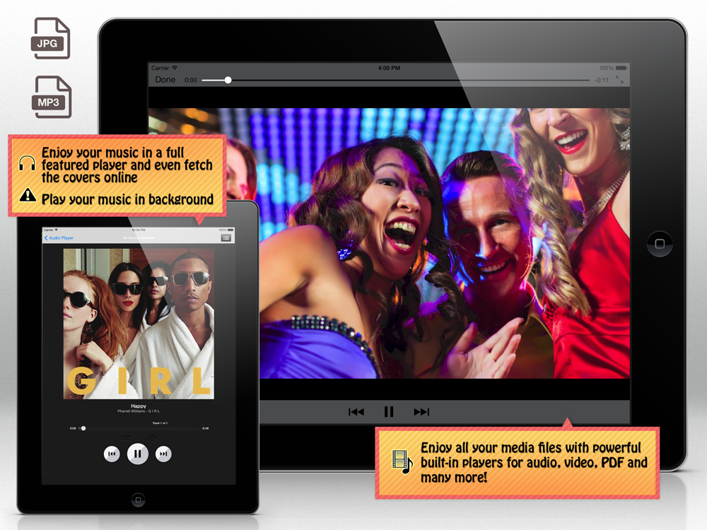 This app transforms your iPhone & iPad to an advanced USB stick, full featured music player and even more: