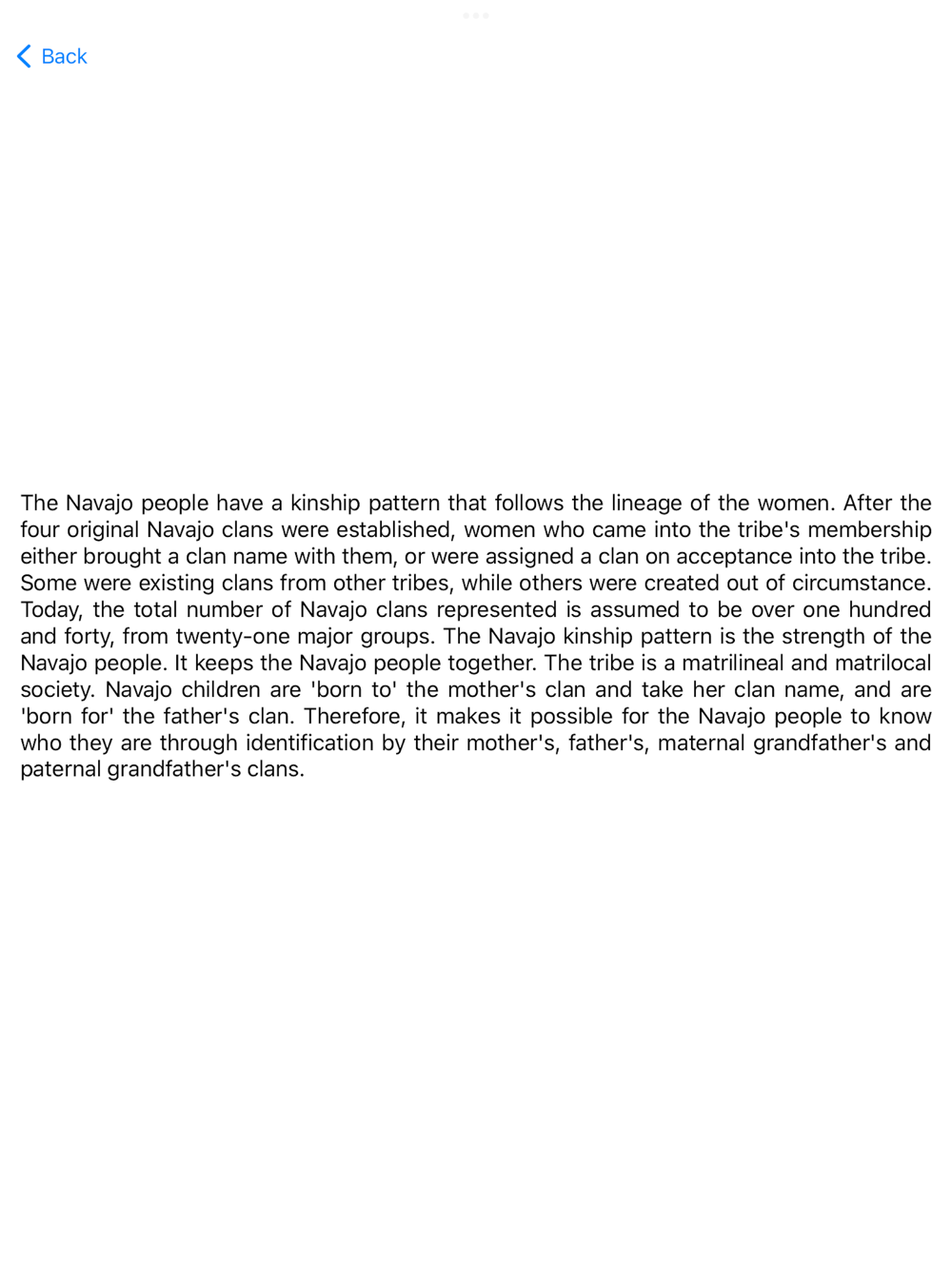 The goal of "Navajo Clans" is to provide correct, accurate and common Navajo clans to everyone interested in learning and preserving the Navajo clan language. This application is the perfect educational learning tool for anyone interested in learning the most valuable artifact to the Navajo people.