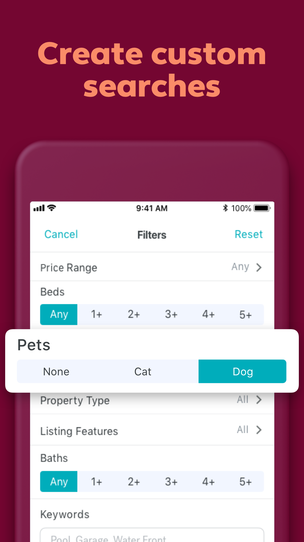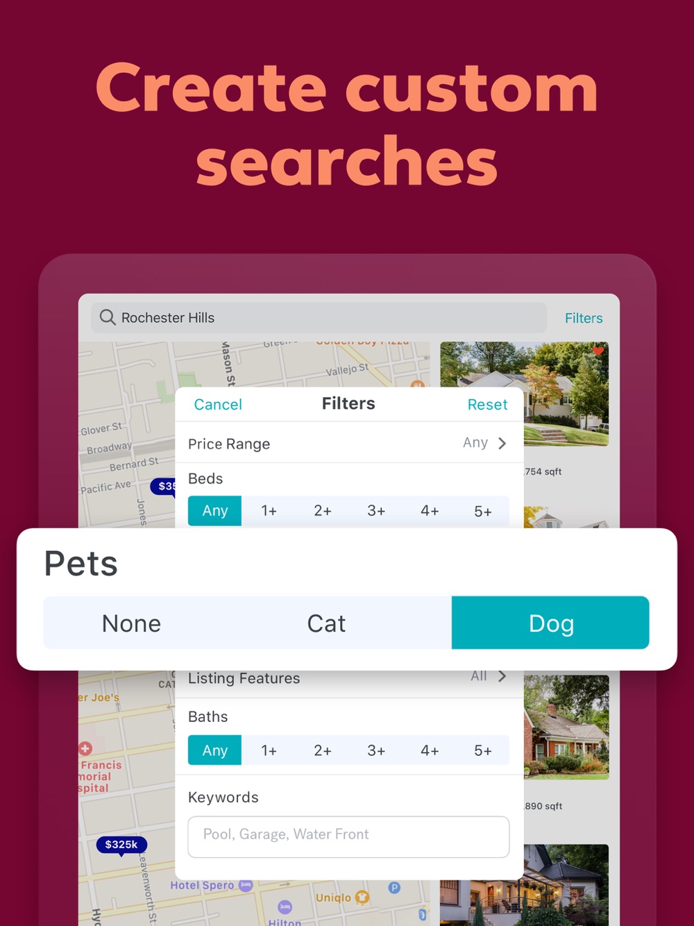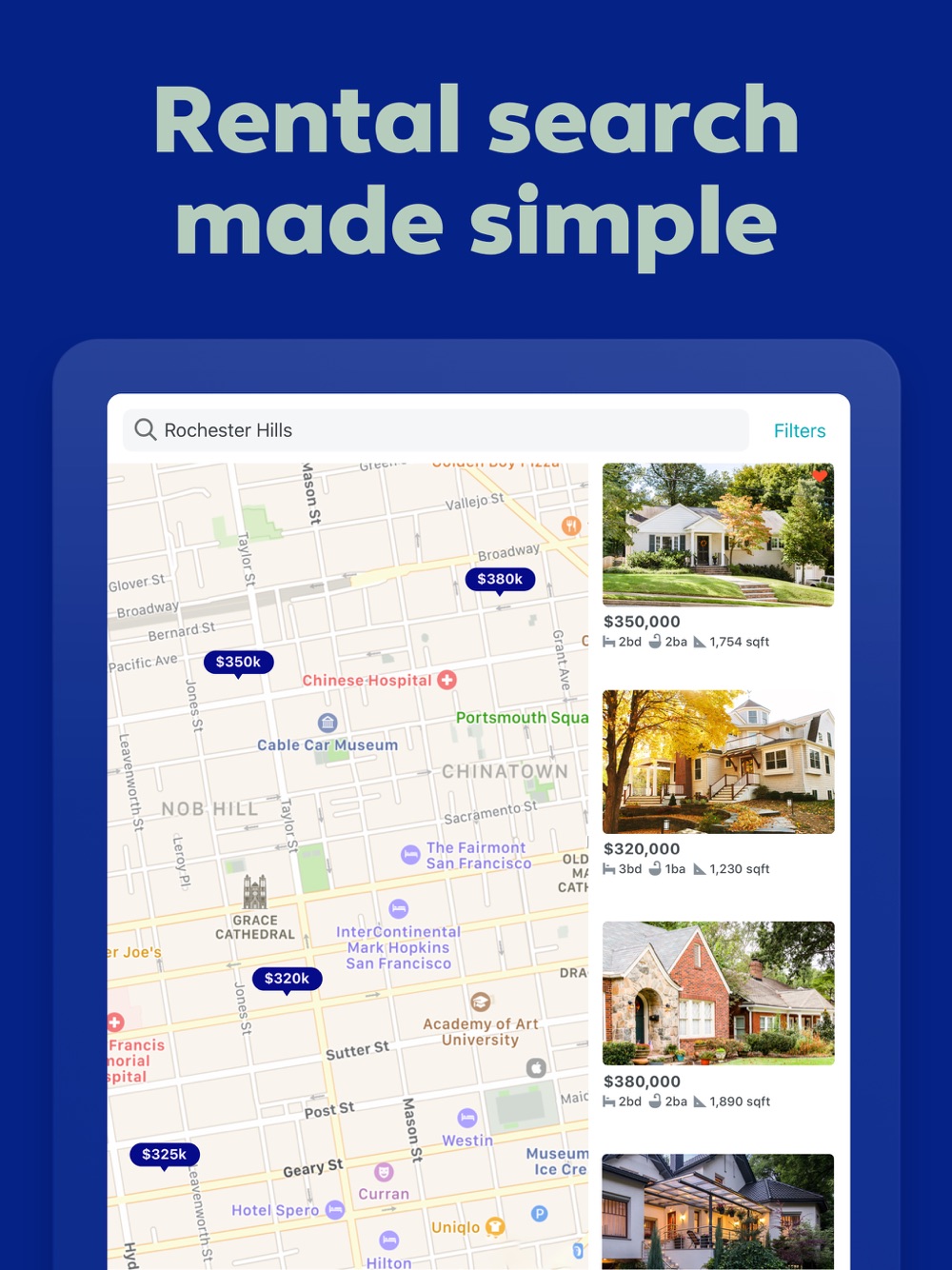 • Custom Searches: Customize your rental search by location, price, number of beds and baths, pet friendliness, and more.
