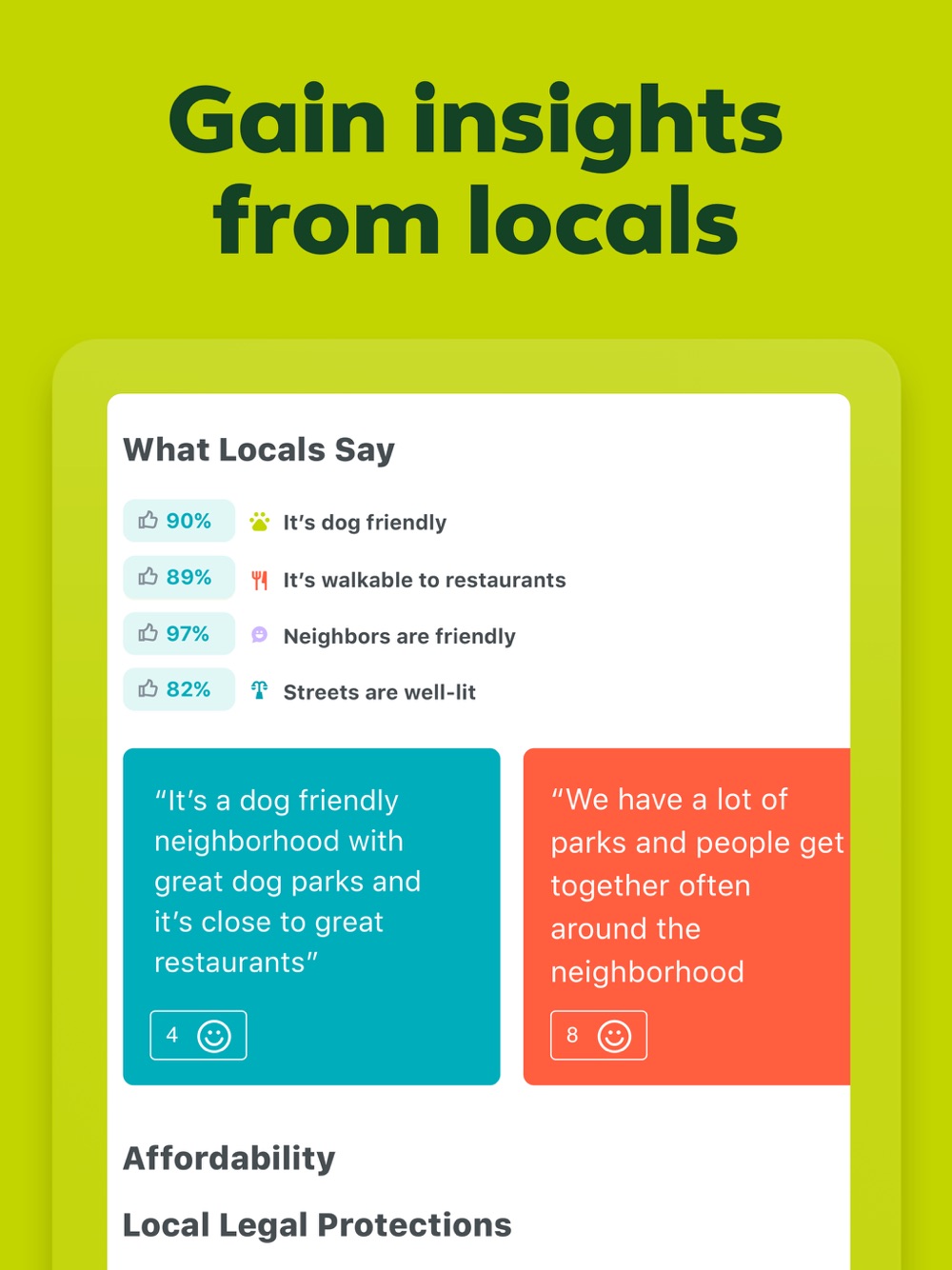 • What Locals Say: Learn what’s to love about a neighborhood—like whether people feel safe walking alone at night, if there’s easy parking, or if people decorate their homes for the holidays —from people who know it best: the locals!