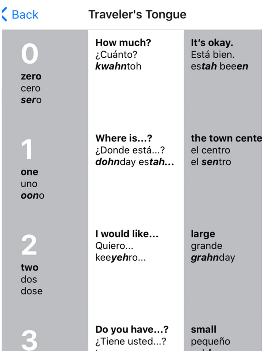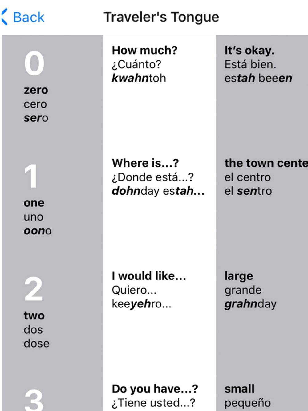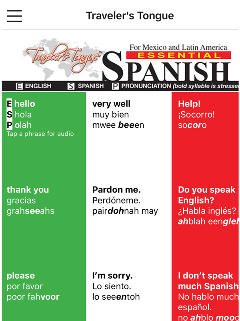 When we travel to a foreign country we are demonstrating an interest in that culture. Speaking a little of the native language is part of the cultural experience. There are many Applications and phrase books on the market that offer far more words and phrases, and they are excellent reference sources. However, Traveler’s Tongue provides the most essential and practical words and phrases. They are meant to be learned because you will have an opportunity to use them often. Each entry provides a written phonetic spelling of the word as well as an auditory function.