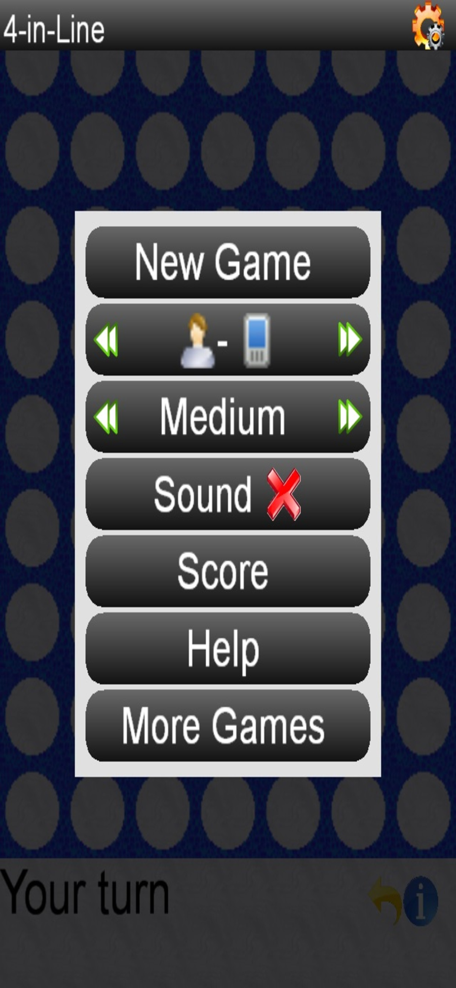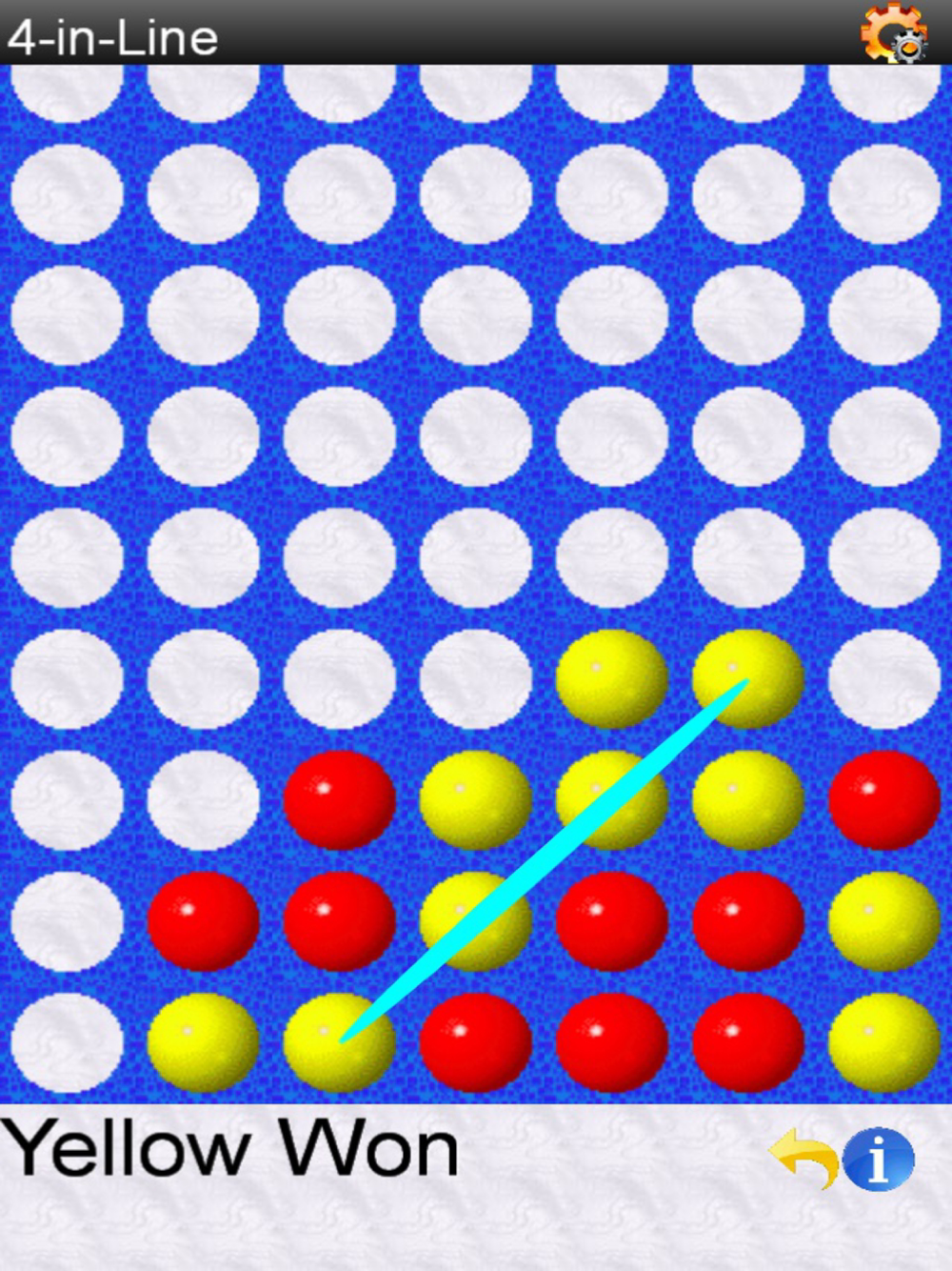 As any successful game, Connect 4 has been ported to numerous platforms. So why should you give our version a try? We largely tried to recreate a full experience of the game in a tiny download package, including powerful AI engine with multiple different difficult levels, ability to play against other person or the phone, undo and hints. Use menu (top right corner) to activate all those features.