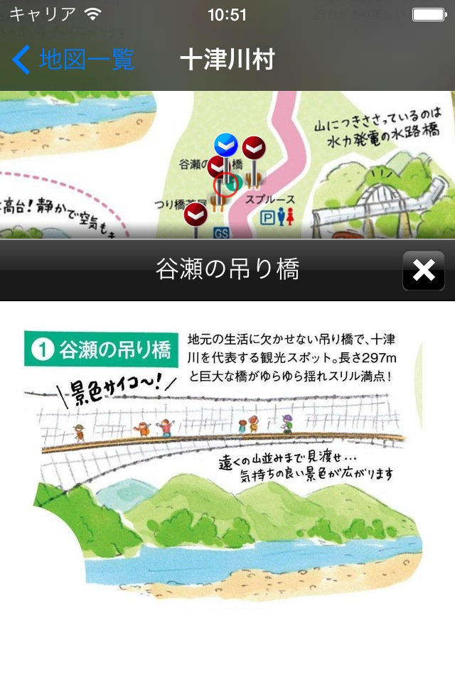 * イラスト地図とGPS情報を対応づけており、地図上に現在地を表示します。