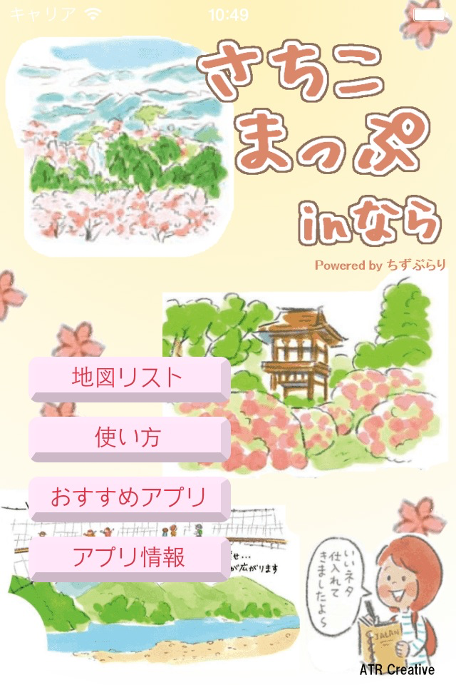 「さちこまっぷ in なら」は、かわいいイラストマップの中に、現在地が表示されるアプリです。かわいいイラストで奈良の里村の神社やお寺、素敵なカフェに案内してくれます。