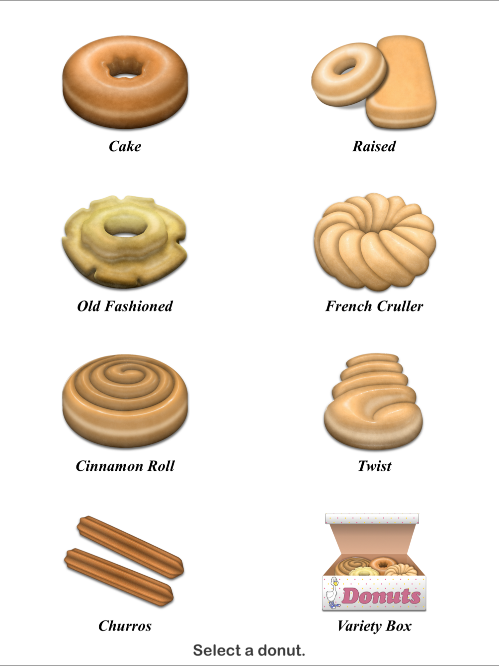 * Sequencing: Each recipe has a variety of sequential steps required to make a donut. Each recipe is slightly different, with some more complex than others.