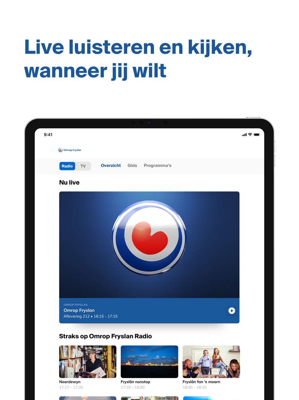 Volg belangrijke evenementen op de voet via onze livestreams. Kijk en luister via de app live naar onze programma's, zoals Fryslân Hjoed, HEA! of Op & Ut. Of wanneer het jou het beste uitkomt. Dan stiest der sa alder machtichst tichtby!