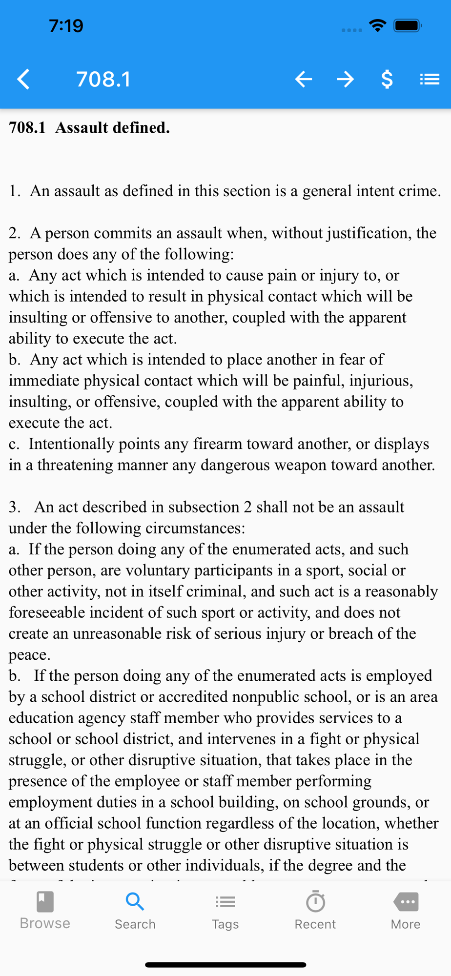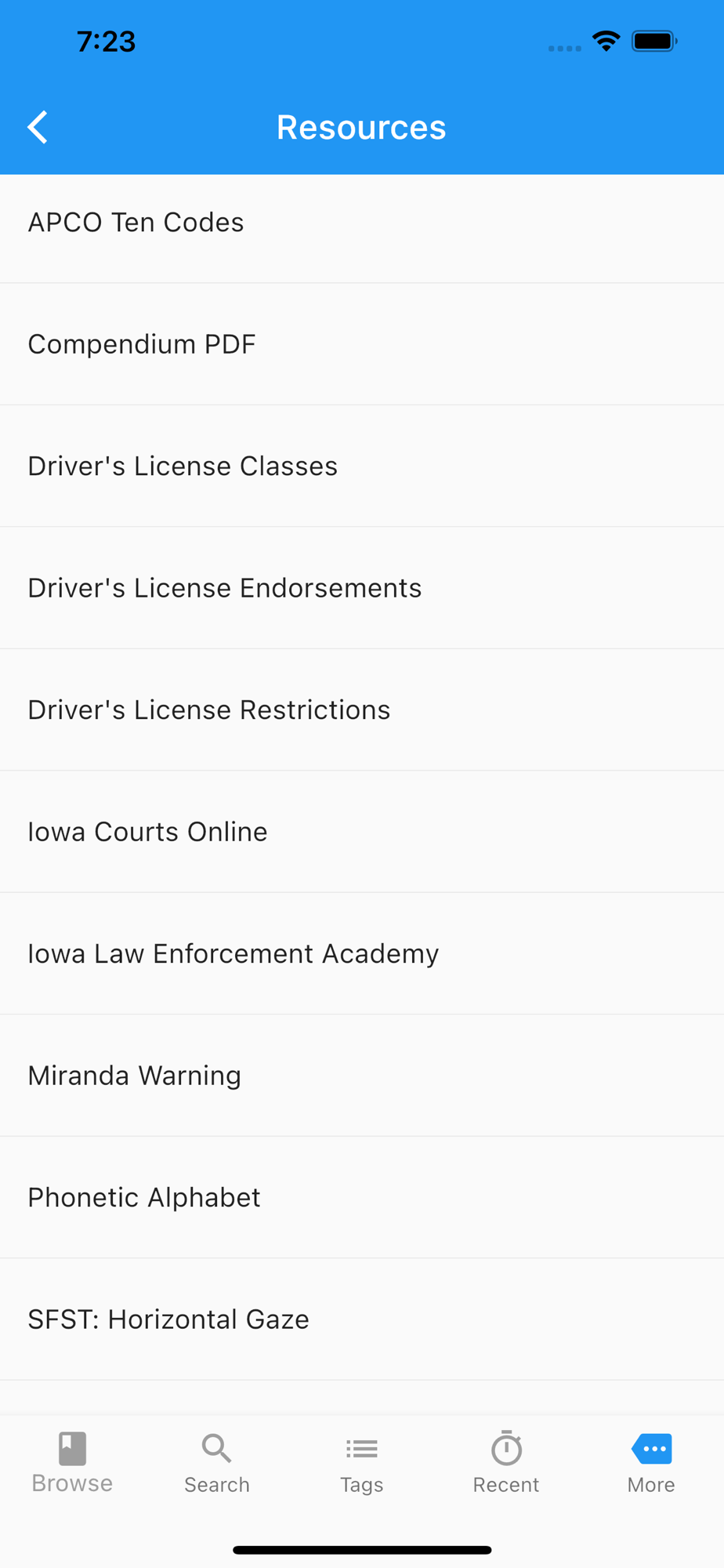 Iowa Police Field Reference is an application for police officers, deputies, attorneys, criminal justice students, and other law enforcement professionals in the state of Iowa. It features a browseable, searchable database of the entire Iowa Criminal Code, Iowa Traffic Law, and other selected chapters that are useful in the daily duties of a law enforcement officer as well as a variety of additional reference material.