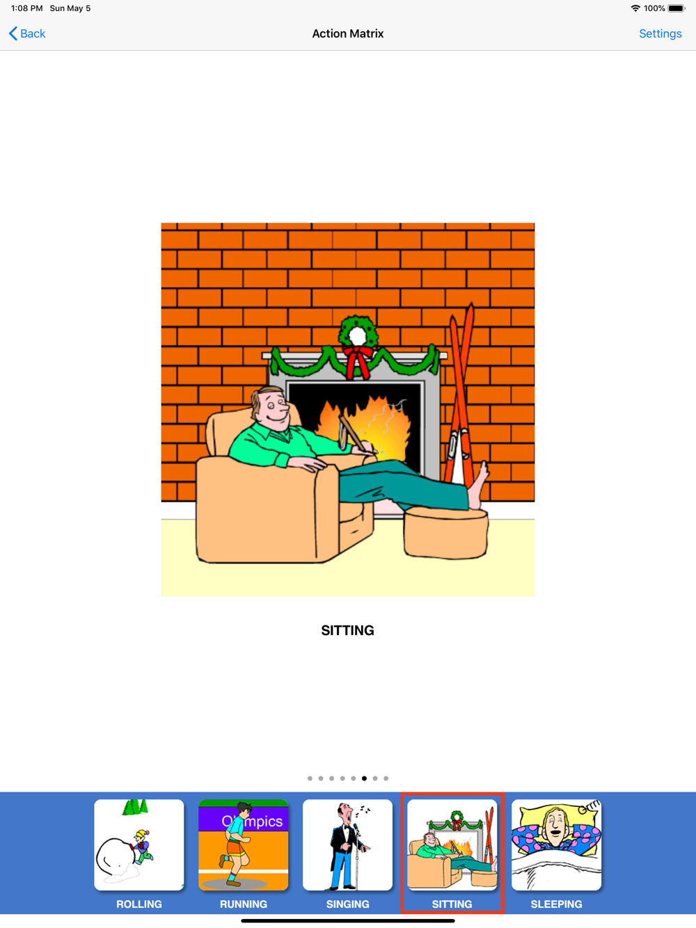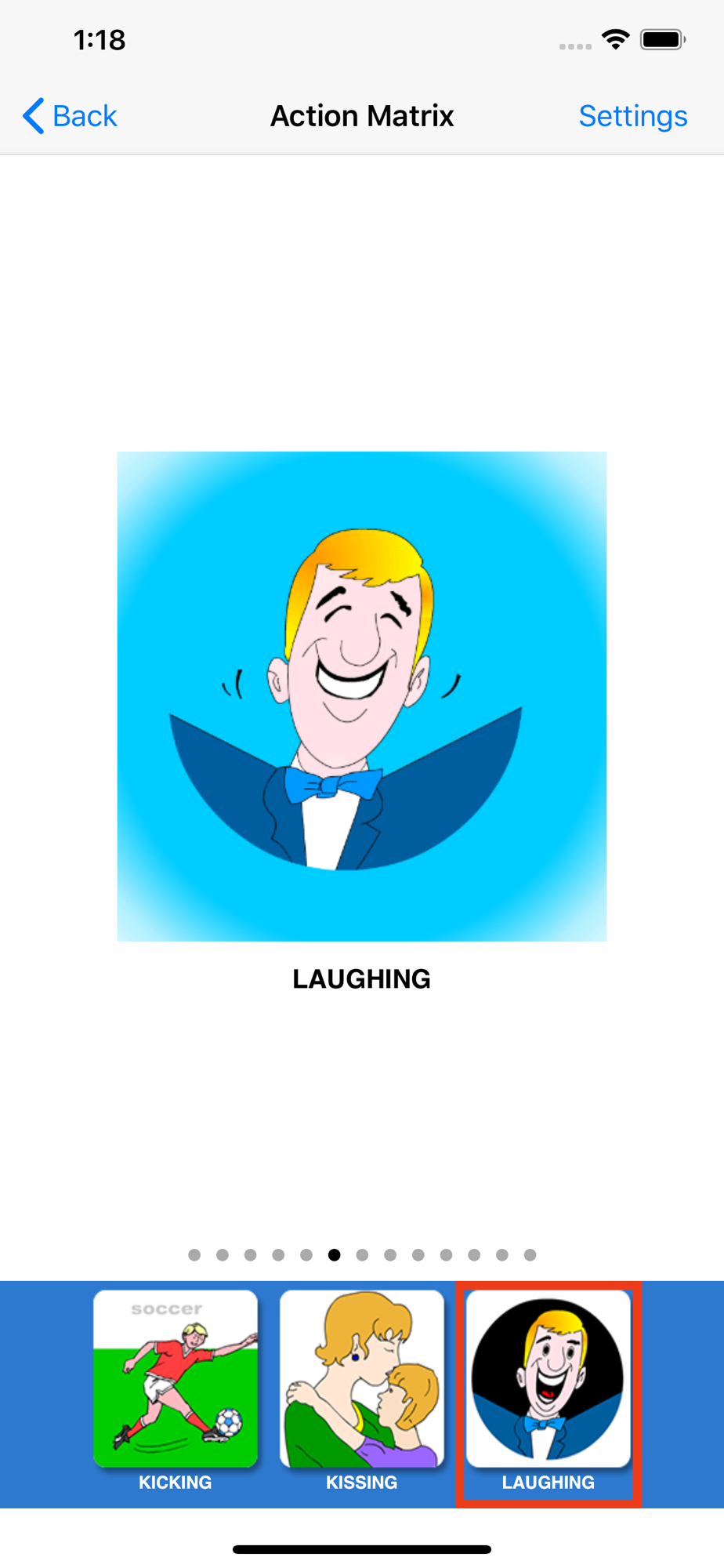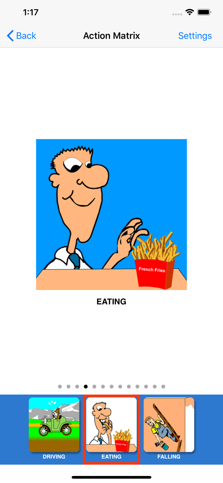 Actions are shown here in a two-row, two-column matrix. When the mouse pointer moves over the picture of an action, an animation related to the action plays in the box on the right side of the screen. There are, in this program, two pictures and animations for each action. Click on the picture to view the next picture and animation.