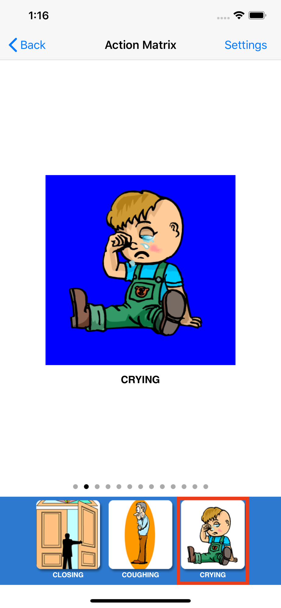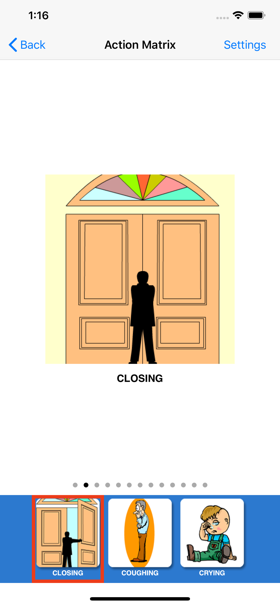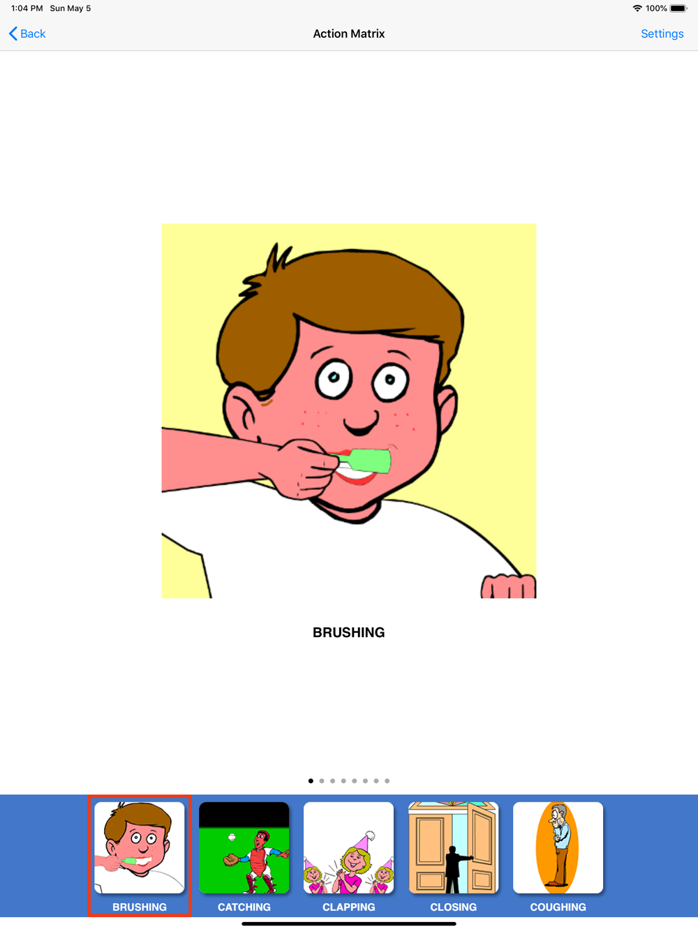 Actions are shown here in a two-row, two-column matrix. When the mouse pointer moves over the picture of an action, an animation related to the action plays in the box on the right side of the screen. There are, in this program, two pictures and animations for each action. Click on the picture to view the next picture and animation.