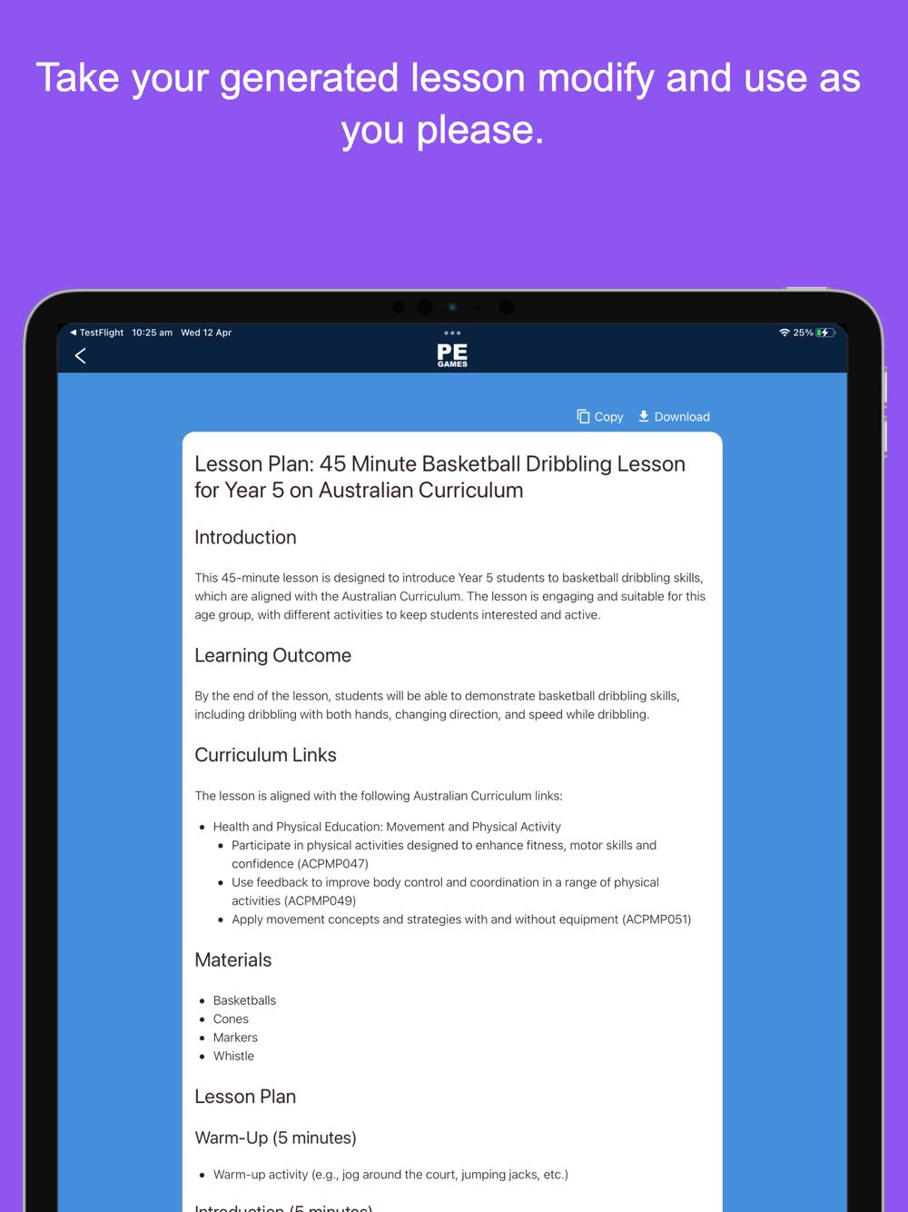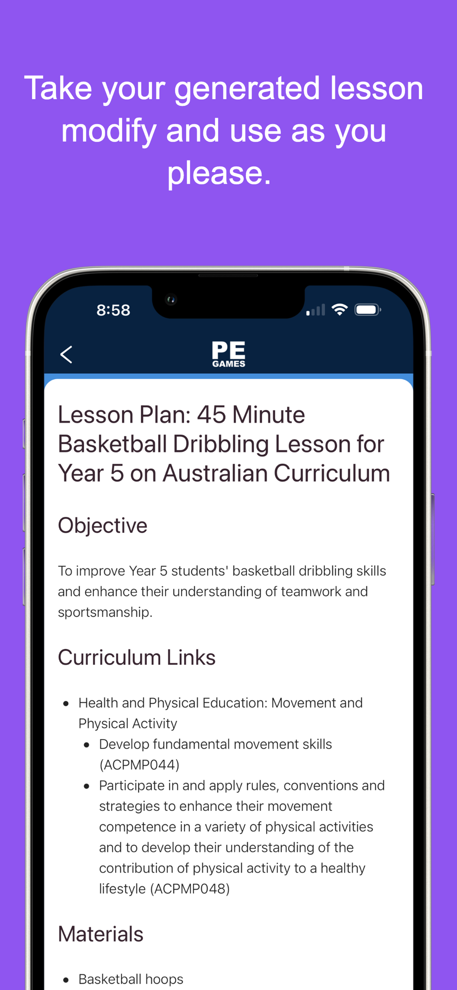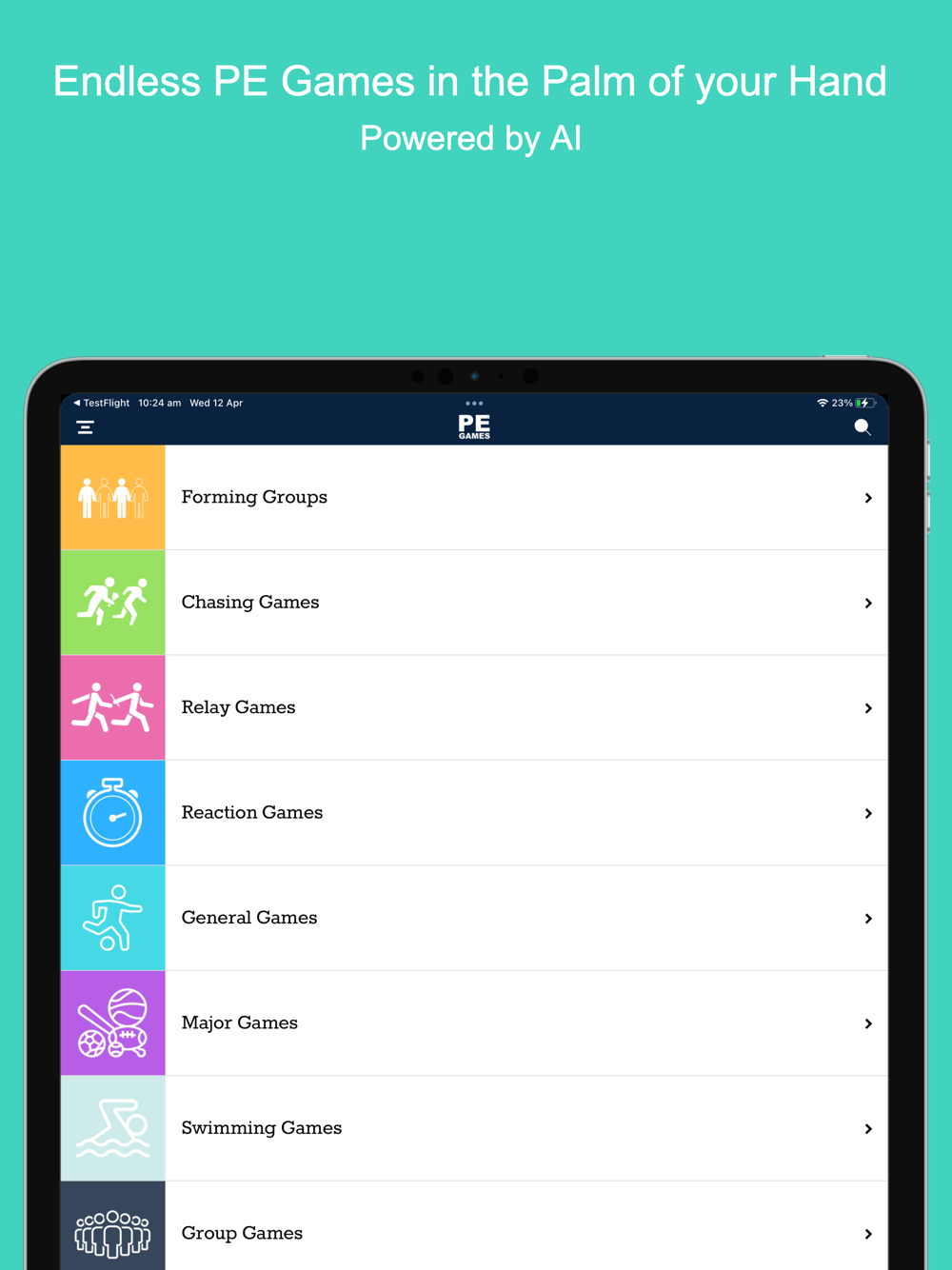 The app also features the innovative PE Games Generator. Enter your available equipment, and the app will instantly recommend a game designed for your students and resources.