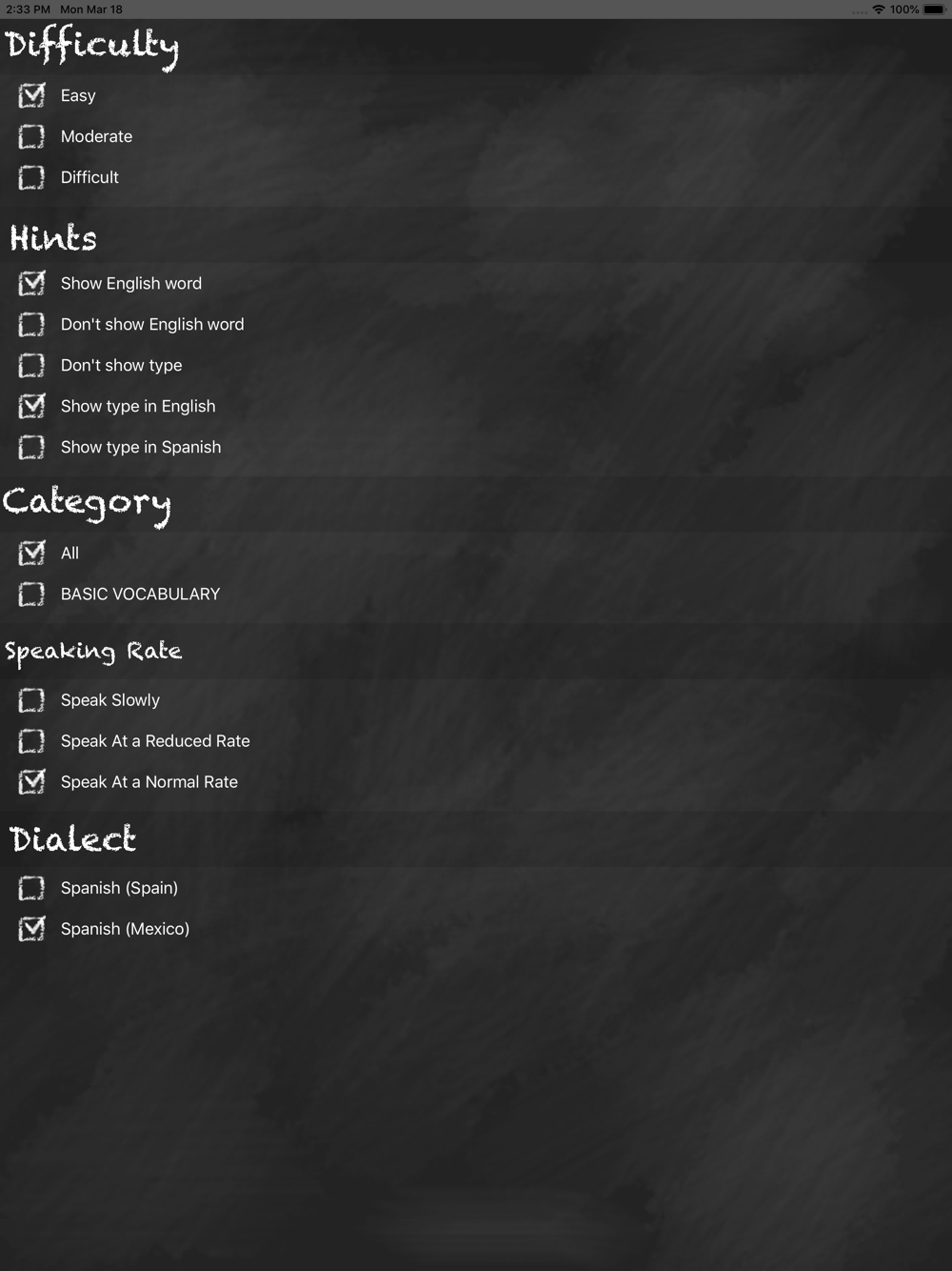 The game play is highly configurable, with 3 difficulty settings, and optional hints including the corresponding English word, and type of word (lexical category) in English or Spanish.