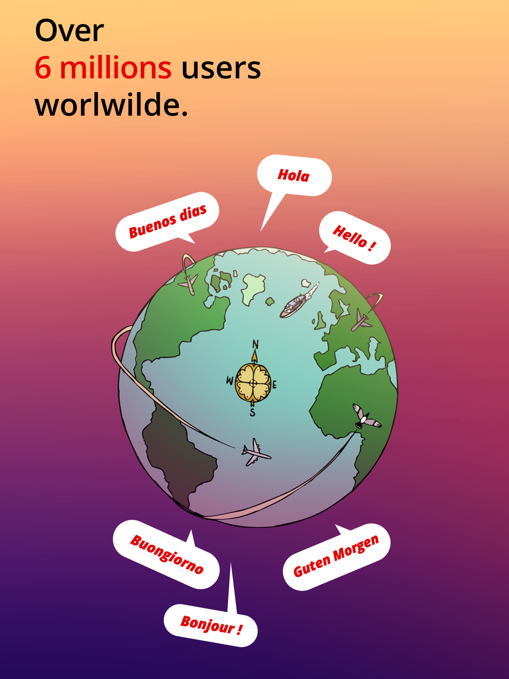 The Gymglish method has been tried and tested by over 6 million users worldwide. Our English (Gymglish), French (Frantastique), Italian (Saga Baldoria), German (Wunderbla) and Spanish (Hotel Borbollón) courses are available in several user languages.