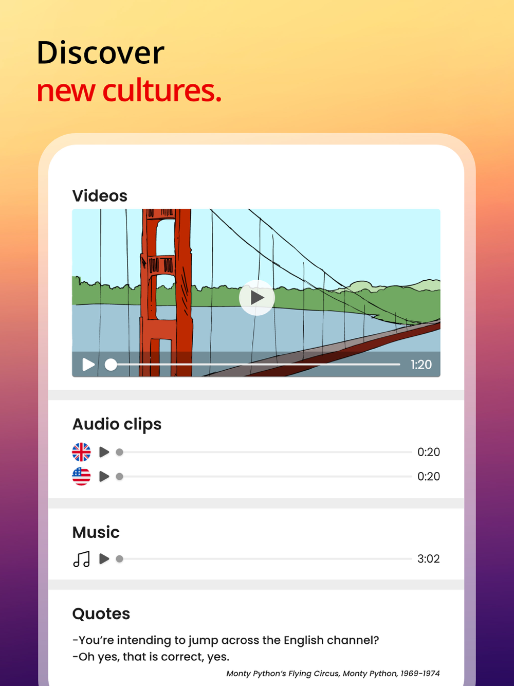 Each of our lessons ends with a "dessert": an authentic cultural reference (film, series, music, etc), allowing you to explore the richness of English, French, Spanish, Italian or German culture.
