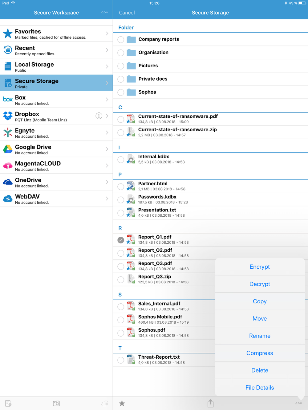 • Publish corporate documents on an Egnyte or WebDAV server or distribute them through Sophos Mobile.