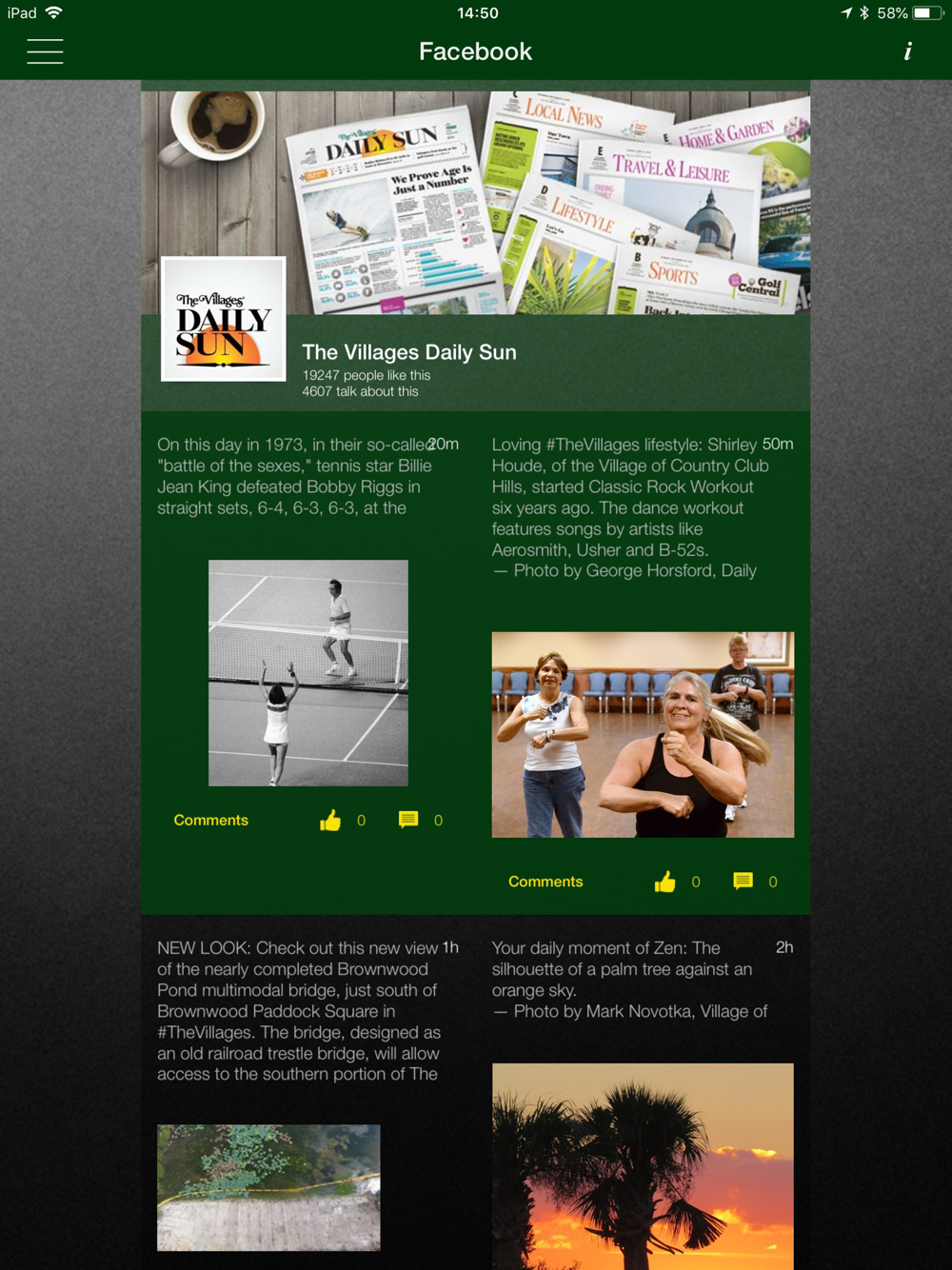 The Villages Daily Sun is now in your pocket! Download The Villages Daily Sun Mobile to find out what's going on in The Villages right from your iPhone or iPod. Make sure to enable push notifications on this updated version of our app to have important Villages news pushed right to your device. Look for many other updates and enhancements as well.