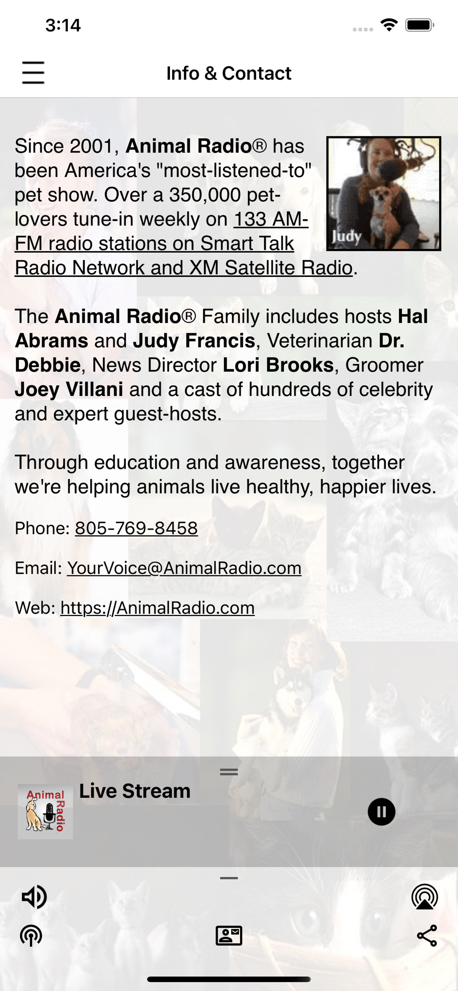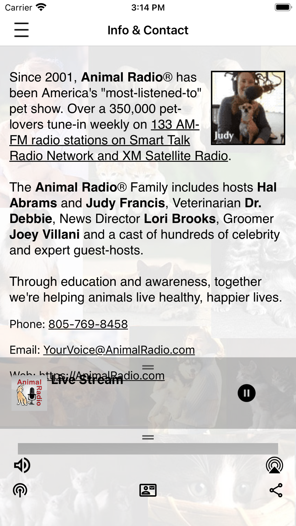 Listen to Animal Radio® wherever you go on your iPhone, iPod touch or iPad. With the Animal Radio® app you can access our vast resources and even ask our veterinarian, trainer or groomer questions about your pet.