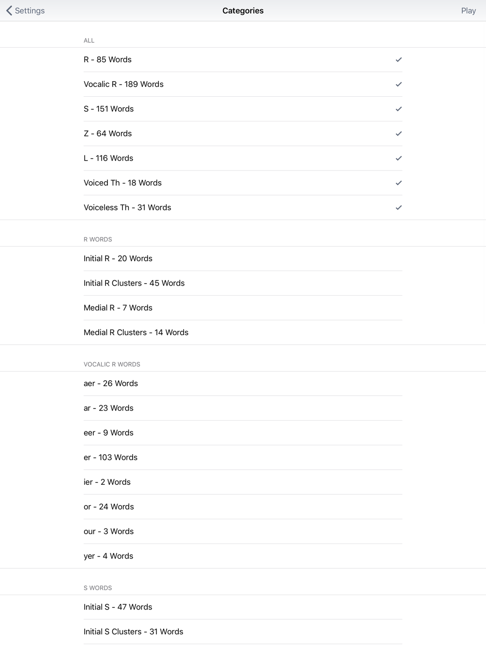Buttons on the screen let you listen to the word, the sounds in the word, a short phrase containing the word, and three sentences. Sentence 1 may add another of the same target. Sentence 2 includes at least 2 of the same target sound and usually is a longer sentence. Sentence 3 likely has multiple target sounds (R, S, L, and/or Th) and will be semantically complex.
