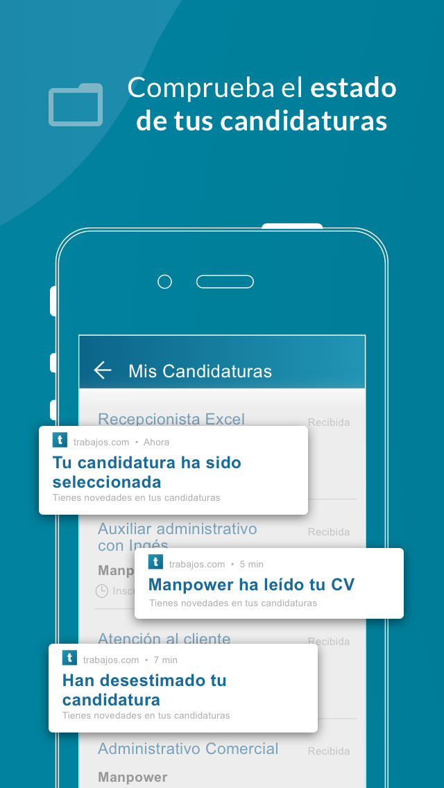 Cualquier cambio que haya en los CV que hayas enviado a las empresas te lo notificaremos de forma inmediata para que puedas ver en todo momento cuál es el estado en el que se encuentran las candidaturas que has enviado. Te daremos toda la información que necesitas para saber si tu currículum ha avanzado en el proceso, la empresa lo ha leído, te han descartado, …