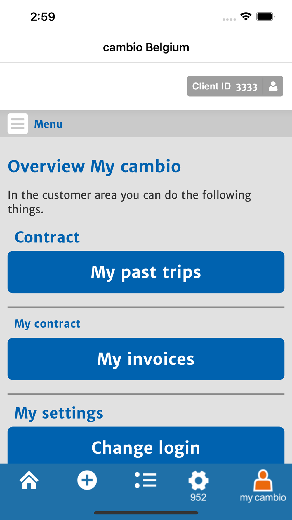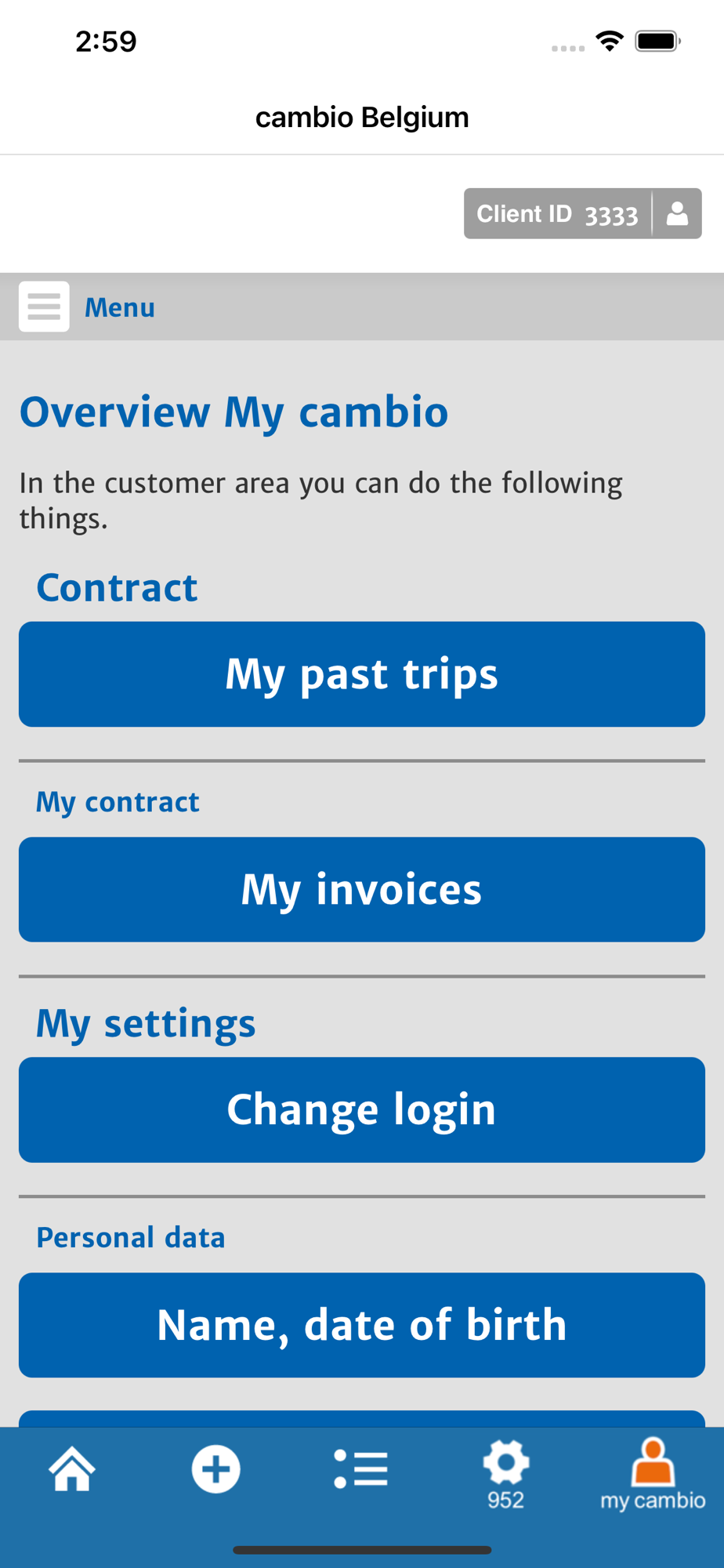 The section “Mycambio” keeps on expanding. You can now do the following: Look at your personal data, change your contact information and address, change your login data and contact customer service. You can also consult your invoices up to two years old, and a trip list for the past 36 months. From now on you can consult your current user limit and purchase trip credit online if needed.