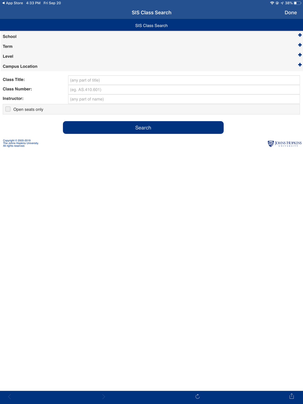 Courses - a directory of current and upcoming courses at JHU, separated by school, term, dept