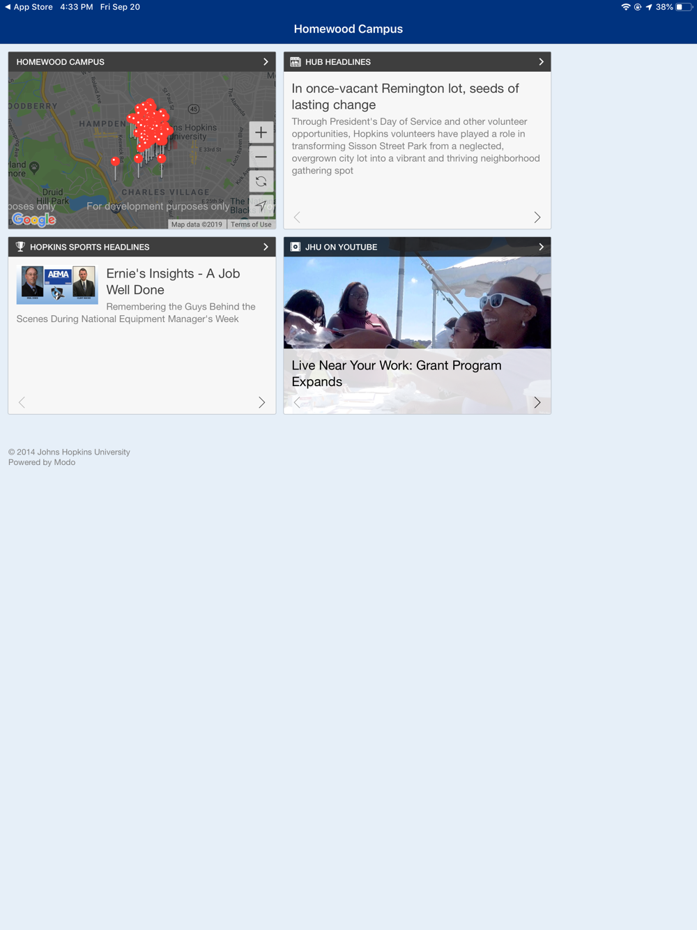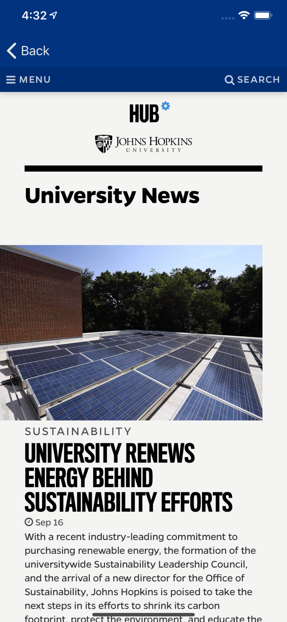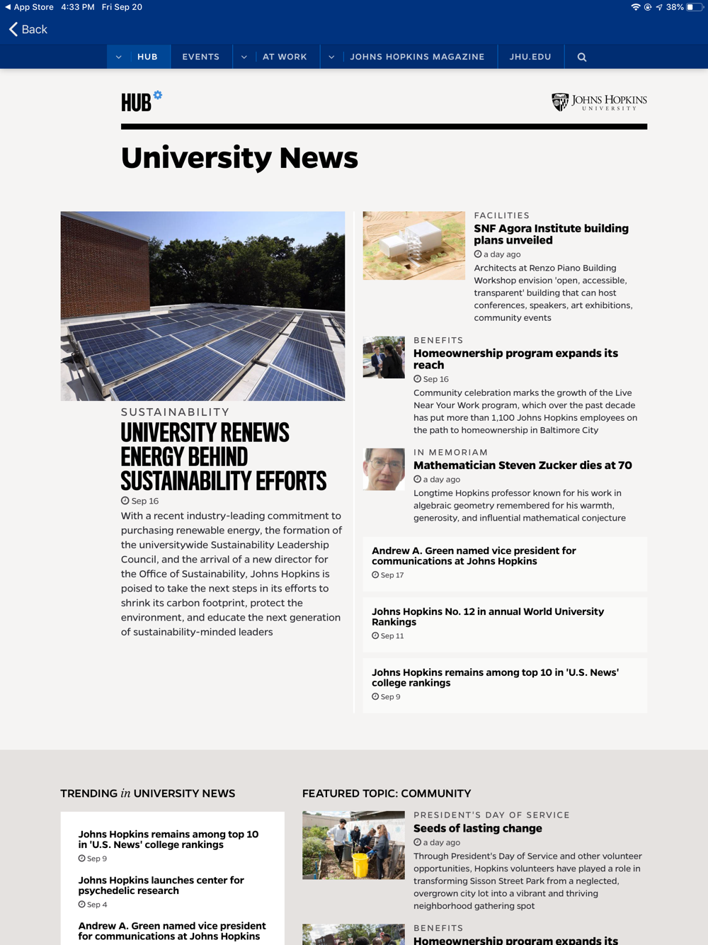 Stay connected with Johns Hopkins University wherever you are. Find out how to get around campus, search lists of courses, stay up to date with the latest campus news, keep tabs on Blue Jay sports, and more! It’s Johns Hopkins University in the palm of your hand!