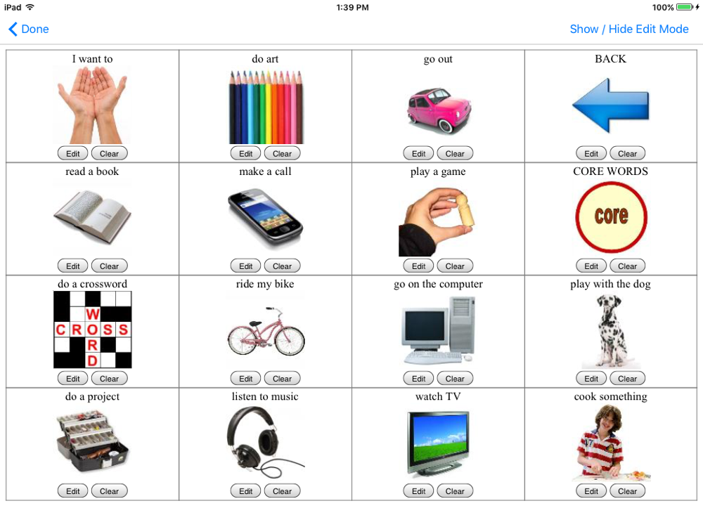 A collection of linked augmentative communication pages for a teen in the home environment. Includes pages for eating, drinking, feelings, needs, getting dressed, washing up, books, music, movies, cooking, games, sound effects, and much more.