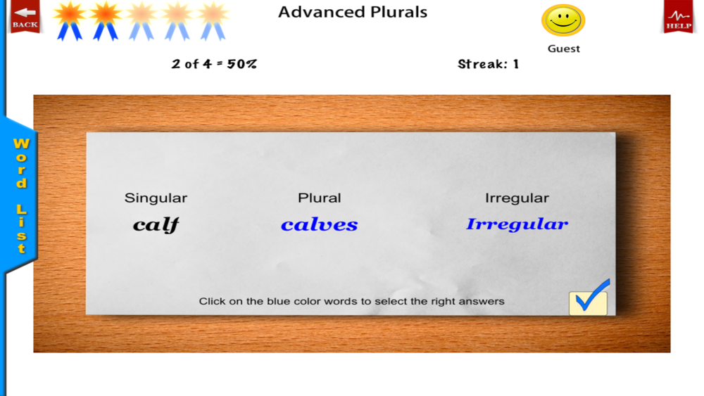 In the Advanced Level, the student is presented with each noun and must select the correct plural. The student must also correctly identify the plural as either regular or irregular.