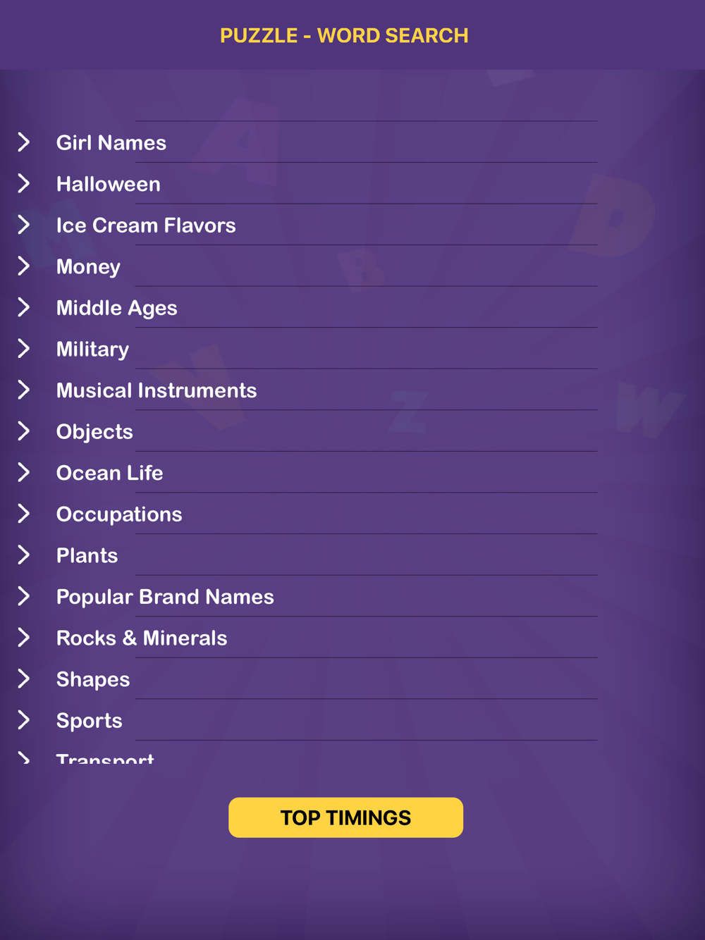 Play the all time favourite word search puzzles game. Totally Free! There are hundreds of words divided into 39 different categories. Have a blast playing word search puzzles and sharpen your brains! Search for the words from the grid of letters as fast as possible.