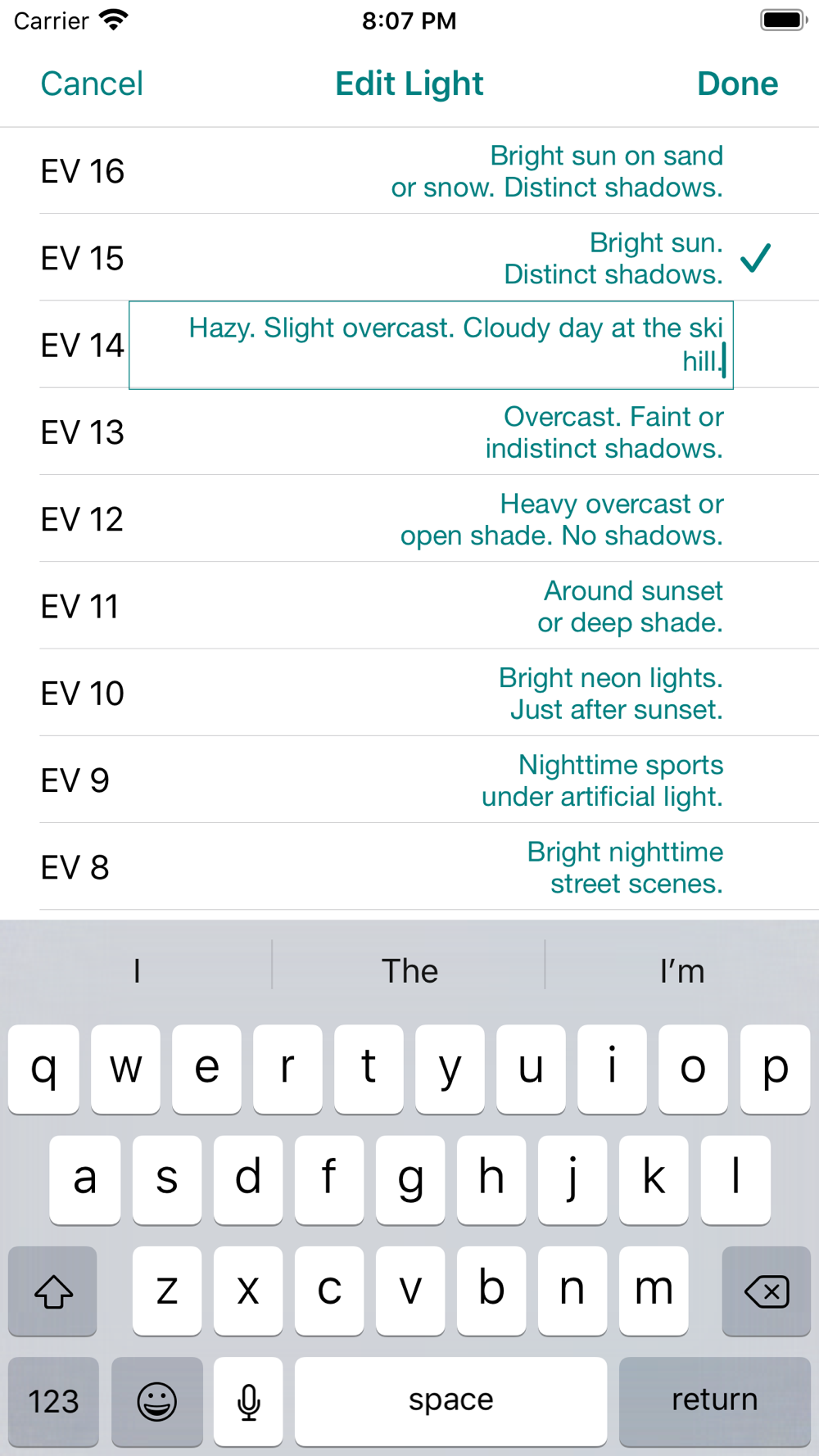 • Lighting: naturally occurring lighting conditions expressed in EV 100. Don't worry if you don't know or care what EV is, just use the descriptions.