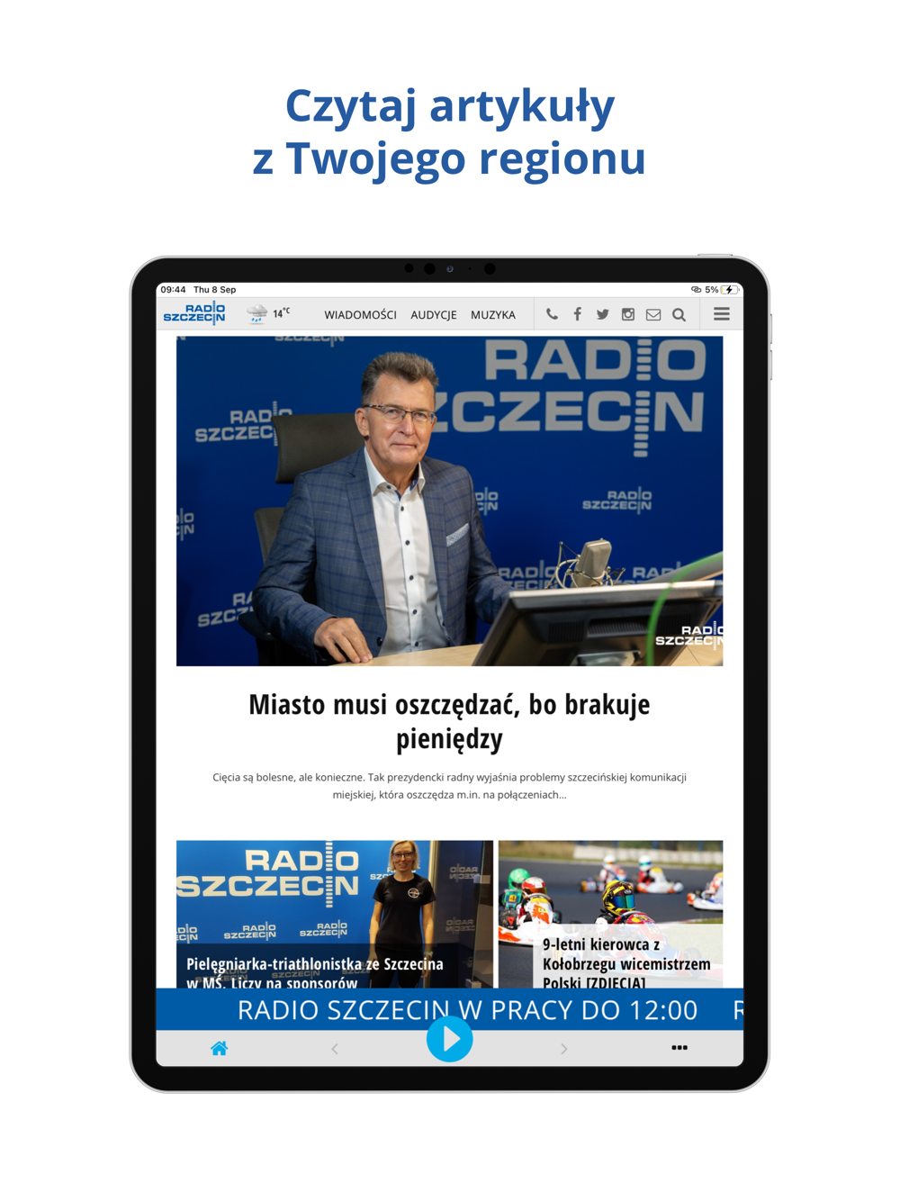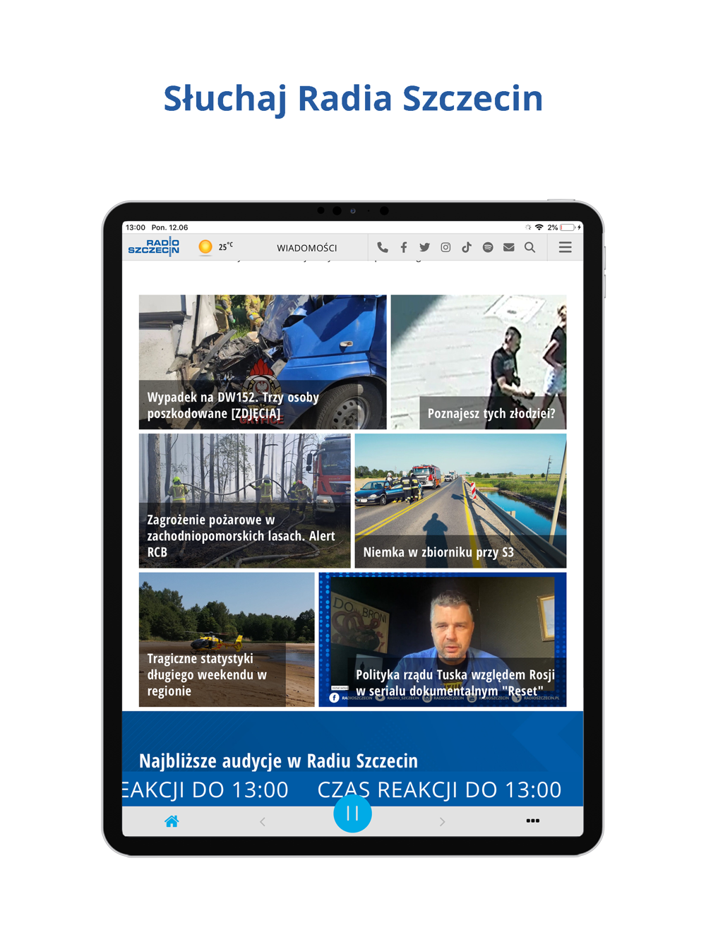 Radio Szczecin is a local radio station with the biggest reach in the region. It is aimed at everybody who is interested in quick and solid news, in-depth journalism, the region's history, tourist curios and good music. News concerning life in Szczecin and other smaller and bigger cities and towns of West Pomerania dominate on air. Our broadcasts provide information about the most interesting events from political, social, cultural and sports life. Throughout the day we transmit traffic news on the current situation on the roads both in Szczecin and the region.