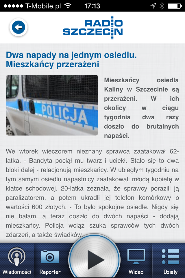 Aplikacja pozwala śledzić na bieżąco wszystkie wydarzenia, przeglądać serwis video oraz wysyłać informacje, pliki filmowe i zdjęcia z ciekawych wydarzeń.
