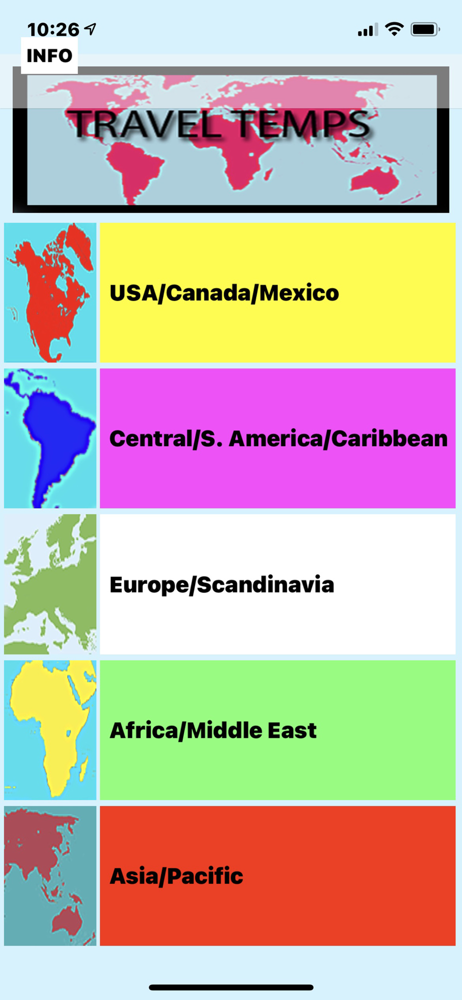 Do you like to plan your vacations months in advance? Do you often wish to know what's the average temperature and precipitation at your destination in the time frame you're considering? Or do you only have a certain window of dates to plan and wish to find a destination where the temperature at that time is to your liking? Then TravelTemps is for you. The top 102 travel destinations are listed, reached by menus that begin with 5 major geographic areas. In each of these areas are numerous destinations and when you touch one, a table will appear with the pertinent information. Once you are done, just touching the BACK button in the upper left will bring you right back to the previous screen in the app for further investigation. Easy to use and faster than internet searches.