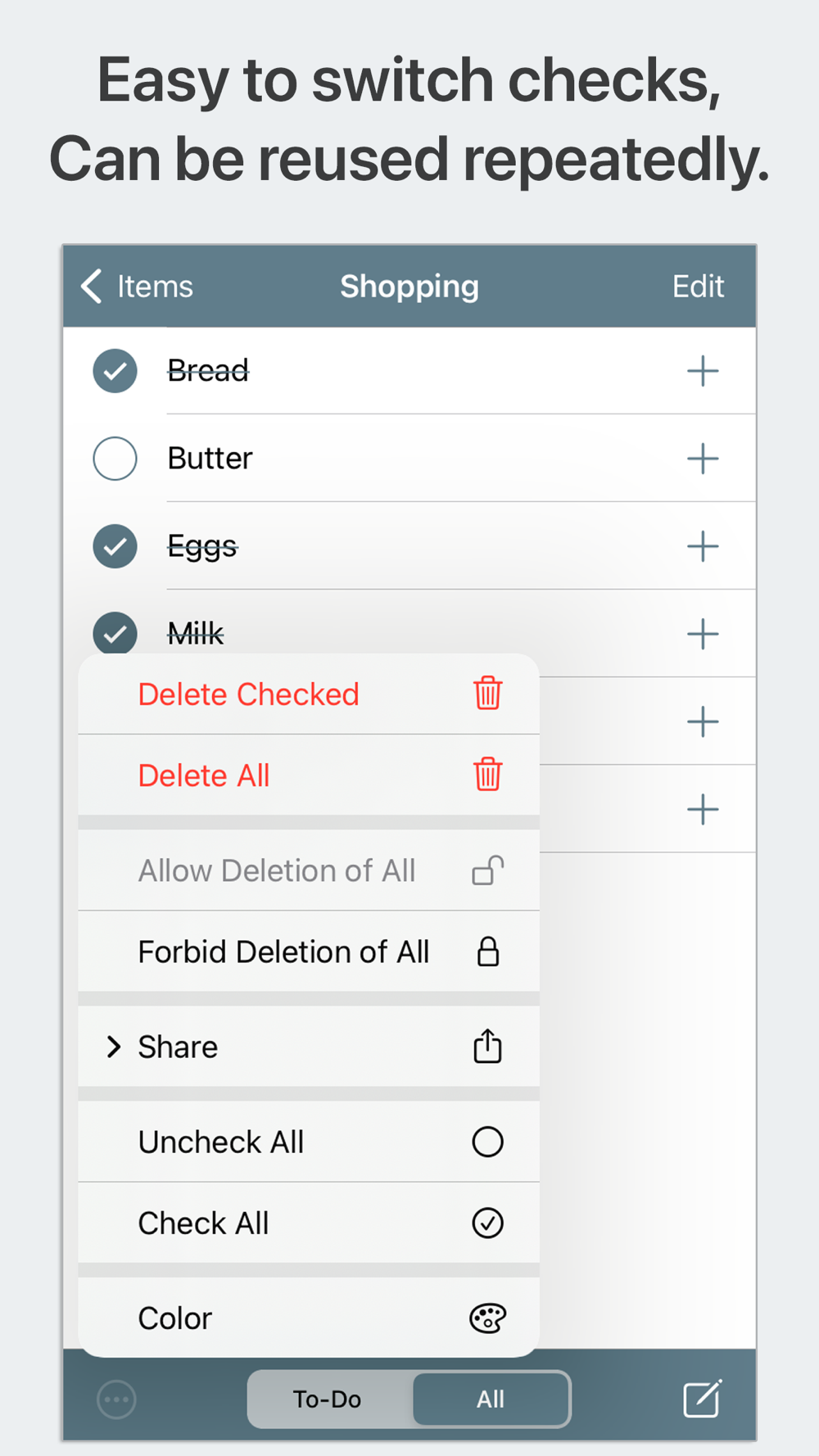 ・Switching between completed and uncompleted status: Tap the check button to switch the check on and off. You can also tap the menu button in the bottom left of the screen to switch the check on and off all at once.