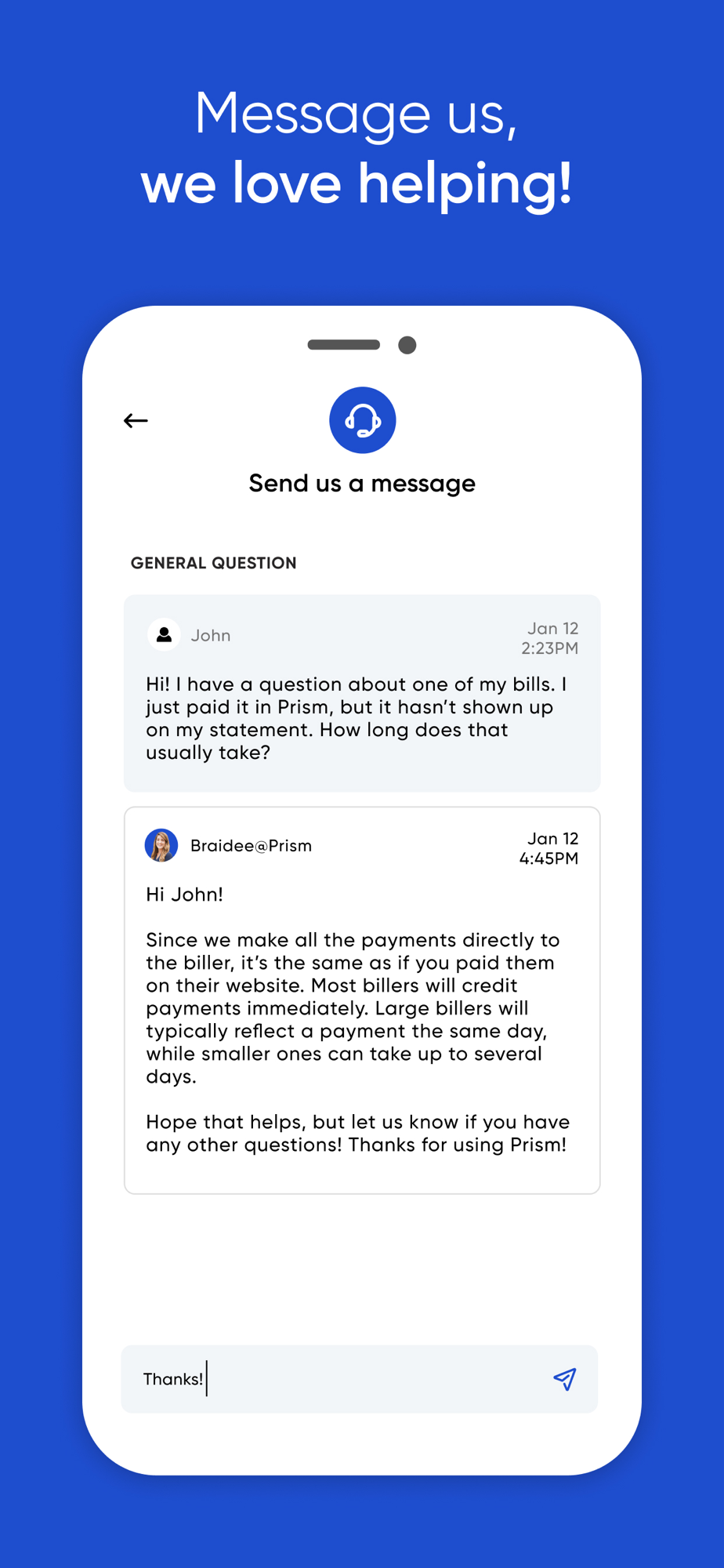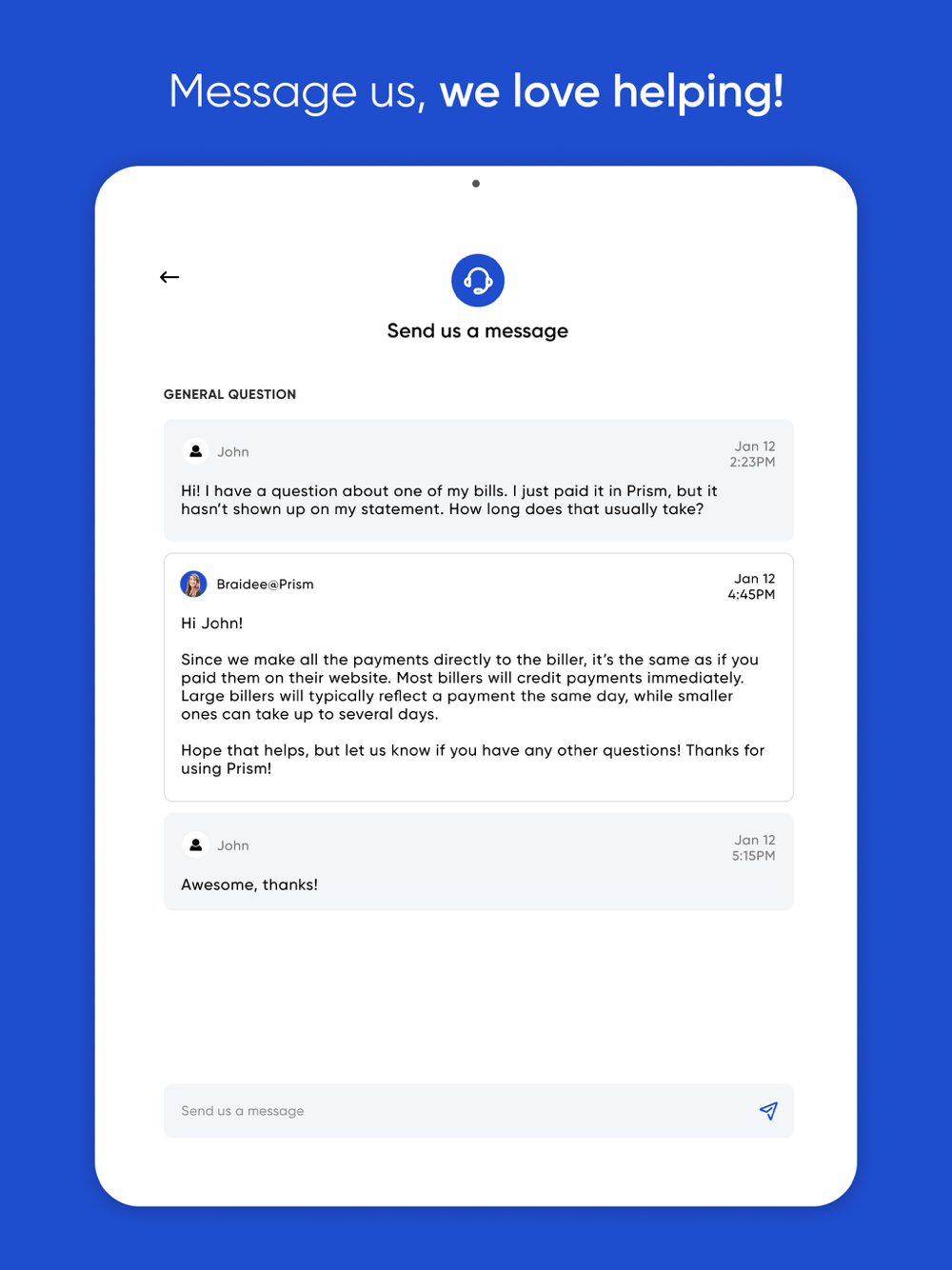 Want to get in touch? Find us on Facebook or Twitter @PrismMoney, or message us in the app.