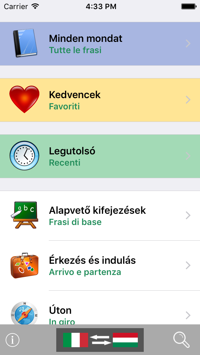 Thanks to the multiplicity of its lexicon, the Italian to Hungarian phrasebook and translator is really indispensable for a traveller: the included phrases have been specifically selected for tourism and for short - middle term stays. The interface has been designed to be easily readable: the translated phrase is highlighted in red, so all you have to do in order to communicate is to show the screen of your device, and you will be understood in no time!