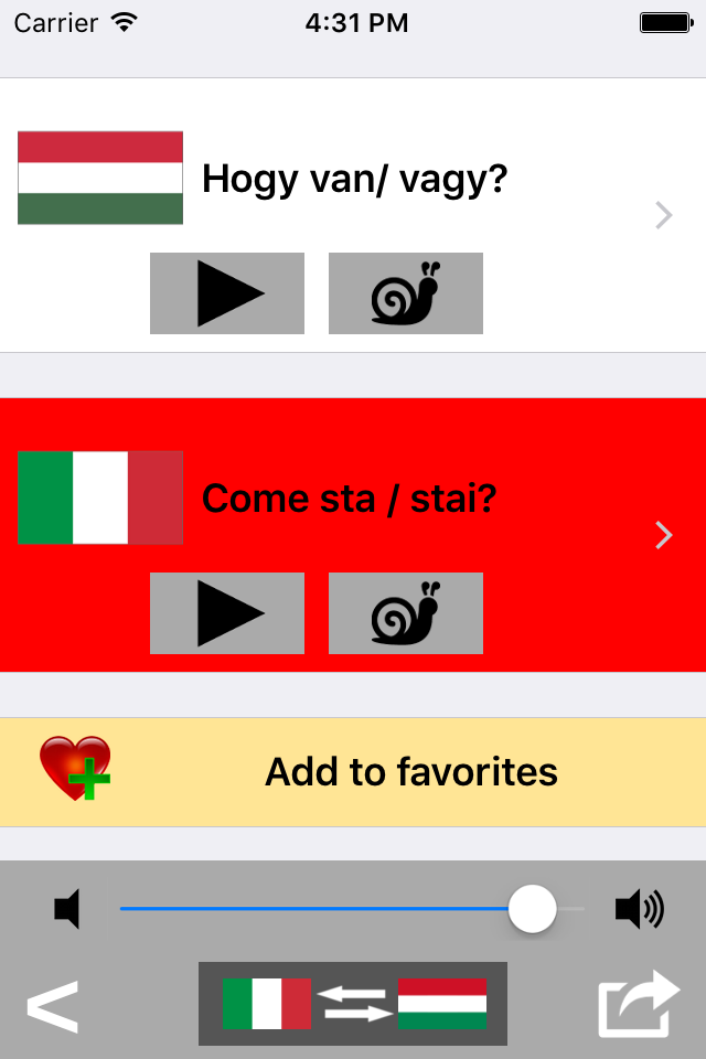 The Italian to Hungarian phrasebook and translator is also useful for language learning / improvement: you can save the phrases in a favorites section for easy access, and use them later to train yourself with the pronunciation.